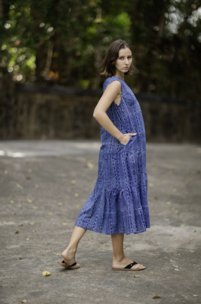 2025年の新しいデザインになります! とっても貴重な、インドの職人産が手作業で、草木を原材料とした顔料を使って染め上げるバグルー染めの布を惜しげもなくふんだんに使ったティアードワンピースです。 使っている布はなんと4M以上!でも薄いコットンだから重たくありません! 風が吹いた時に揺れるワンピースがなんとも素敵です。 そのままご着用いただいても、チューブトップのようなものをインナーとしてご着用いただいてもどちらでも素敵に着こなしていただくことができます! ポケット付きです! 何層にも重なるティアードを丁寧に仕上げているため1日に熟練のテーラーが作れるのは1着のみ!エクスクルーシブなワンピースをお楽しみください! ★素材について 綿100% こちらの布、白のインド綿から写真のようになるまで4日以上のたくさんのプロセスを踏んでこのような素敵な染め物になります。 芸術品のように美しい布をお楽しみください。 ★サイズ (平置き) フリーサイズ 普段S-Mをご着用される方向き モデルは168センチ *サイズはお写真の一番最後にございます、サイズチャートをご参照くださいませ。 ★備考 ・全て検品を行っておりますが、縫製が若干あまかったり商品のサイズ・大きさなどが多少前後する場合がございます。ご購入の際はご了承の上、お買い求めお願い致します。 ・実際の色味よりスクリーン環境により異なって見えることがございます。 ・ご注文後のイメージ違い・サイズ違い等の商品交換・返品はお受けできませんので予めご了承くださいませ。 ★Jonnoについて Jonnoの商品は全てバングラデシュの自社スタジオでお作りしています。(布をカッティングマスターが裁断する以外は全て一人の担当者が全工程を責任持って担当しています。)現在は9名のスタッフが日々Jonnoの商品を丁寧に日々縫製しています。 ★おすすめなお洗濯方法 デリケートなど洗濯機の中にある脱水弱めの設定で洗って、シワを伸ばし干してください。乾燥した後シワが気になりにくくそのままご着用いただけます!(完全にシワがなくなるわけではないので、デイリーユースの場合のおすすめになります。) *シワシワになりやすいので乾燥機はお避けください。 3930005000