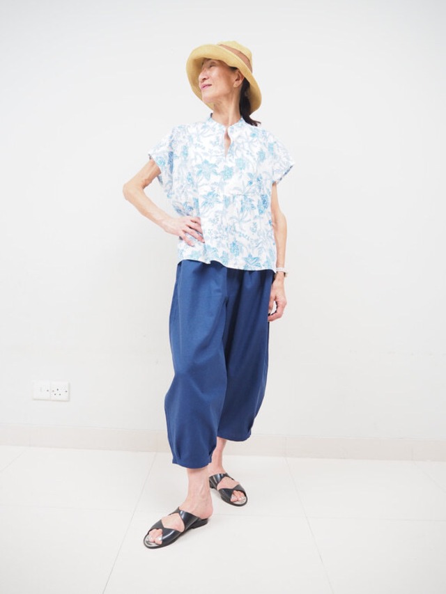 インドの手仕事ハンドブロックプリントコットン生地で楽チンに履いていただけるけどキレイに見えるワイドパンツを作りました! 綺麗に見えるようにふんだんにギャザーを入れ、ふんわり広がりのあるパンツに仕上がっています。なんでも入れられるように大きめなサイドポケット付きです。 布はたくさん使っていますが、とても薄くて軽いコットンなので、重い感じは全くせずリラックスタイムにもお出かけにも重宝いただけると思います。 ジョンノはバングラデシュ で縫製マスター8名が在籍している小さなスタジオです。 自社ブランド作製のほかセレクトショップさんのオリジナル商品のお作りをお手伝いさせていただいています。 工業製品のように、部分部分担当を変えるのではなく、ひとりの縫製マスターが責任を持って丁寧に1着をお作りしています。なので、時間はかかりますが、とっておきの一枚が仕上がります! ★素材について ジャイプールコットン(100%) 洗濯機にてお洗濯いただけます! ★サイズ (平置き) フリーサイズ モデルは165センチです。 総丈: 86cm 股上 42cm 股下 50cm ウエスト : 58cm-75cmくらいまで対応しています。 ゴムが10cmにわたって入っているので締め付け感なく履いていただけるかと思います。 ★納期 ご注文をいただいてからお作りするため、2−3週間お時間を見ていただいております。 ★備考 ・全て検品を行っておりますが、縫製が若干あまかったり商品のサイズ・大きさなどが多少前後する場合がございます。ご購入の際はご了承の上、お買い求めお願い致します。 ・実際の色味よりスクリーン環境により異なって見えることがございます。 ・ご注文後のイメージ違い・サイズ違い等の商品交換・返品はお受けできませんので予めご了承くださいませ。 お知らせ:円高と原料高騰、輸送費高騰が重なり、苦渋の選択ではございましたがお値段変更させていただきました。ご了承くださいませ。(7月22日)