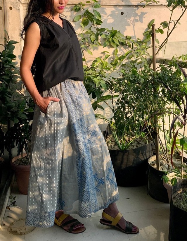 インド綿切り替えギャザーロングスカート(カタスティッチ)