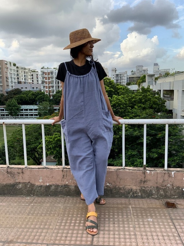 ゆとりのある、サロペットを作りました。 夏場でも通気性がよく涼しく着こなしていただけます。 ジョンノはバングラデシュ で縫製マスター4名が在籍している小さなスタジオです。 自社ブランド作製のほかセレクトショップさんのオリジナル商品のお作りをお手伝いさせていただいています。 工業製品のように、部分部分担当を変えるのではなく、ひとりの縫製マスターが責任を持って丁寧に1着をお作りしています。なので、時間はかかりますが、とっておきの一枚が仕上がります! ★素材について ダブルガーゼ 洗濯機にてお洗濯いただけます! ★サイズ (平置き) フリーサイズ 余裕のあるデザインになっています。 モデルは162cm ★備考 ・全て検品を行っておりますが、縫製が若干あまかったり商品のサイズ・大きさなどが多少前後する場合がございます。ご購入の際はご了承の上、お買い求めお願い致します。 ・実際の色味よりスクリーン環境により異なって見えることがございます。 ・ご注文後のイメージ違い・サイズ違い等の商品交換・返品はお受けできませんので予めご了承くださいませ。 *発送につきまして、日本に在庫がある場合は2−3日中に発送できますが、現地から送る事が多いため通常10-12日程お時間かかります。ご了承くださいませ。 また、通常ご購入いただいた後のご連絡は布に問題があり縫製ができない、などの理由がない限り行っておりません。(販売価格を抑えるために日本人1人で運営しているため、ご了承いただけますと幸いです。)