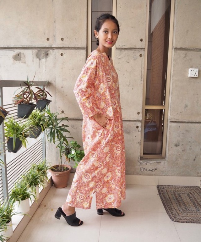 インドのハンドブロックプリントを使ったワンピースです。 ワンピースとしても、羽織としてもどちらにもご使用いただけます。冬の間は中にタートルネックを入れて、夏はタンクトップの上にさらりと羽織っていただける商品です。 ★素材について 綿100% インドの草木染ハンドブロックプリントコットンを使用しています。 とても薄い生地ですので、羽織としてご利用になれるのがおすすめです。 ★サイズ フリーサイズ 着丈 120cm 袖丈 52cm (1-2cm±することがございます。) 二の腕袖幅43cm(一周り) 手首袖幅10cm(ゴムを伸ばさず1周り) ★Jonnoについて Jonnoの商品は全てバングラデシュの自社スタジオでお作りしています。(布をカッティングマスターが裁断する以外は全て一人の担当者が全工程を責任持って担当しています。)現在は9名のスタッフが日々Jonnoの商品を丁寧に日々縫製しています。 ★備考 ・全て検品を行っておりますが、縫製が若干あまかったり商品のサイズ・大きさなどが多少前後する場合がございます。ご購入の際はご了承の上、お買い求めお願い致します。 ・実際の色味よりスクリーン環境により異なって見えることがございます。 ・ご注文後のイメージ違い・サイズ違い等の商品交換・返品はお受けできませんので予めご了承くださいませ。 <820066000>
