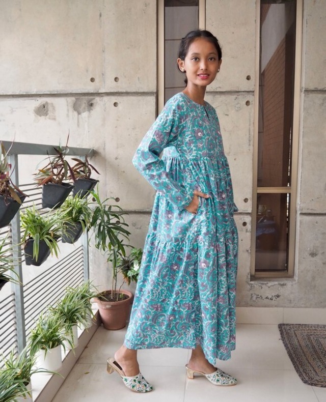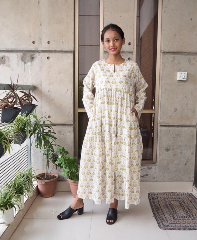 インド綿ティアードワンピース(ハンドブロックプリント)