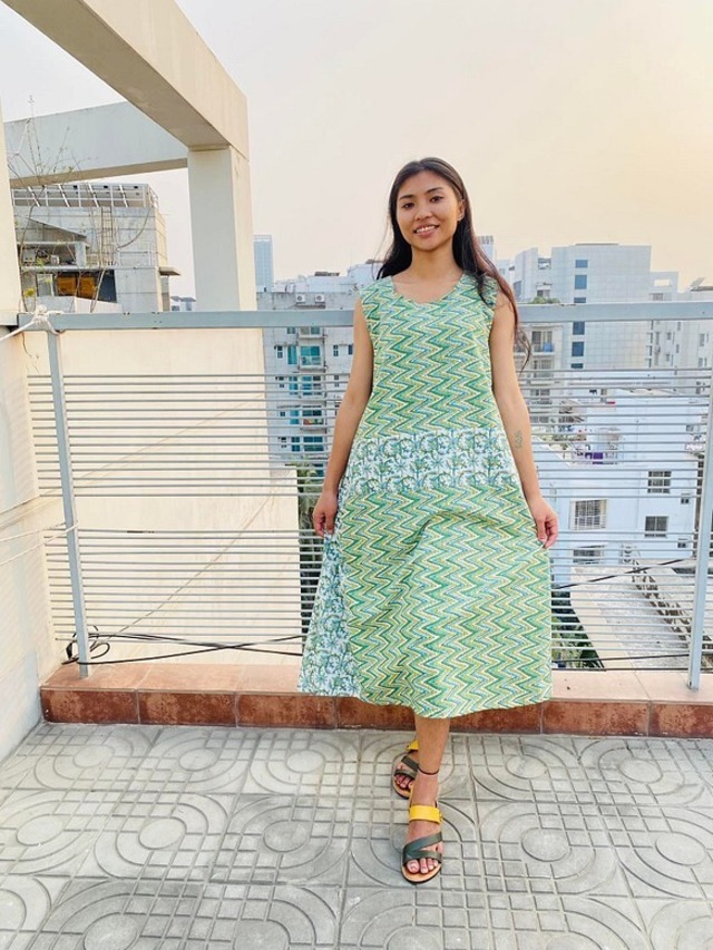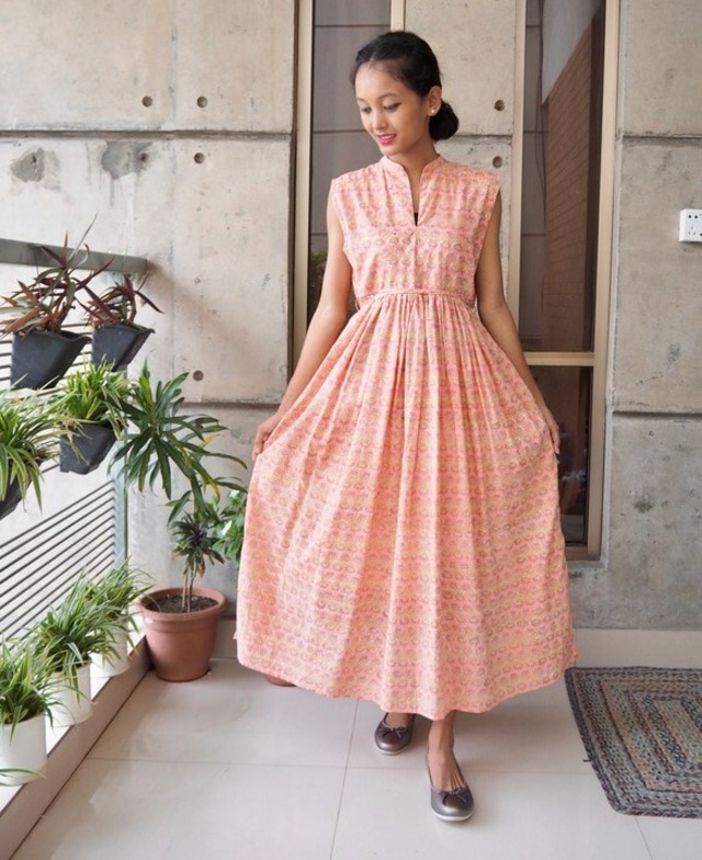 インド綿(ハンドブロックプリント)/Aラインワンピース/マキシ丈
