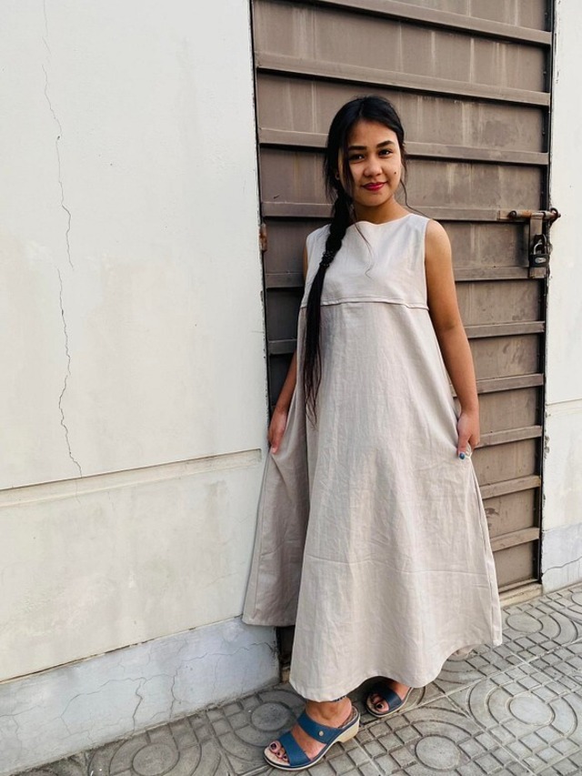 さらっと着れるハンドメイドのノースリーブ のワンピです。 素材はインド産のジョイプールコットンを使用しています。 両脇にポケット付きです。 ★素材について コットン100% ★サイズ (平置き) フリーサイズになります。 150cm-165cmくらいの幅広い身長の方に膝下丈で着ていただけます。 A ラインのワンピースなので、身幅は記載しておりません、。 着丈 120cm ★納期 ご注文をいただいてからお作りするため、2−3週間お時間を見ていただいております。 ★備考 ・全て検品を行っておりますが、縫製が若干あまかったり商品のサイズ・大きさなどが多少前後する場合がございます。ご購入の際はご了承の上、お買い求めお願い致します。 ・実際の色味よりスクリーン環境により異なって見えることがございます。 ・ご注文後のイメージ違い・サイズ違い等の商品交換・返品はお受けできませんので予めご了承くださいませ。