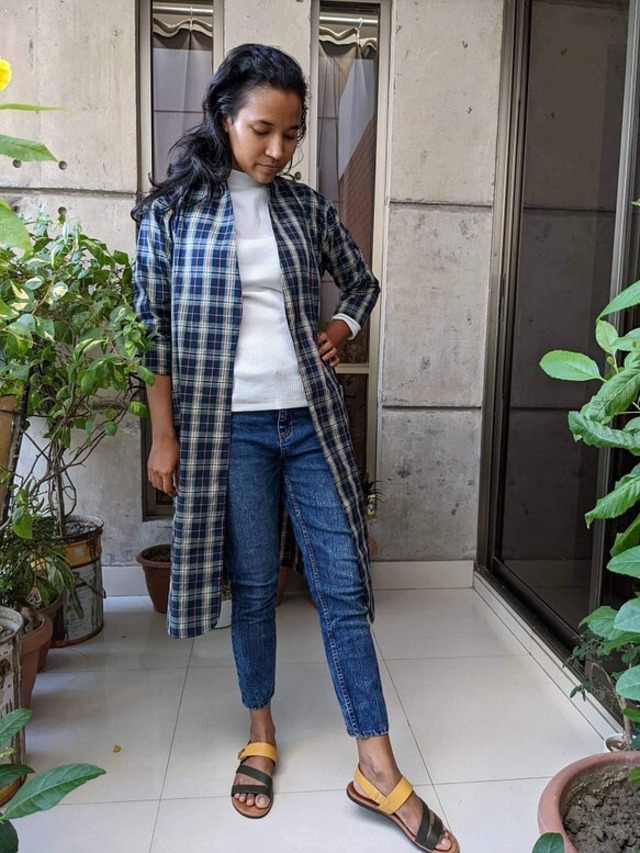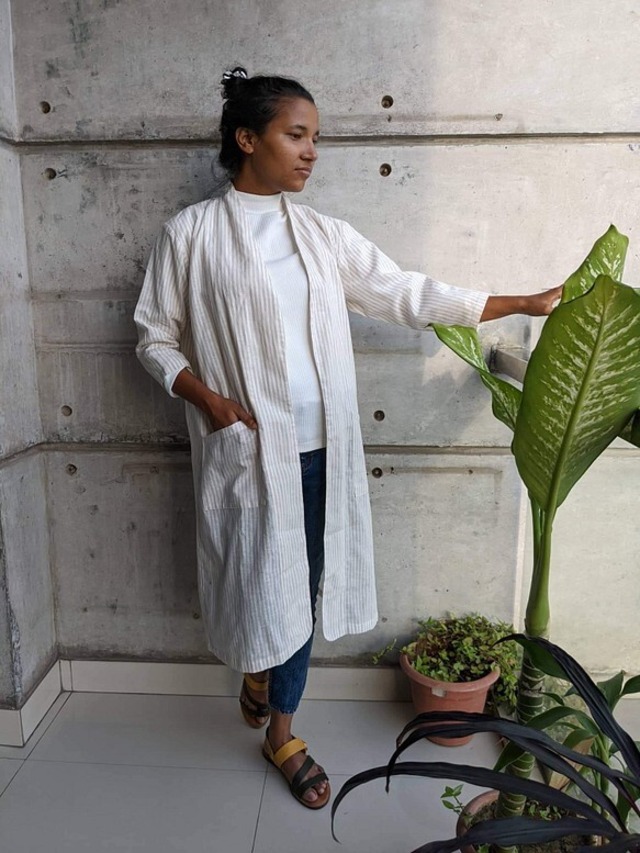 かたくなりすぎず、でもオフィスにも十分使えて肩が疲れない、を目指しました。 ダブルガーゼ素材を使用しています。 袖丈は7部丈です。 総丈 102cm 袖幅 20cm 縫製はバングラデシュに構えている自社ブランド"Jonno"の制作チームが1点づつ丁寧に熟練のスタッフが仕上げています。 在庫が日本にあります分はすぐの発送となりますが、在庫が切れている場合3-4週間ほどお時間をいただくことがございます。 お急ぎの場合は事前にメッセージをいただけましたら縫製目安をお伝えさせてitだきます。 お知らせ:円高と原料高騰、輸送費高騰が重なり、苦渋の選択ではございましたがお値段変更させていただきました。ご了承くださいませ。(7月22日)