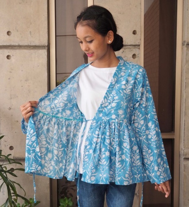 インドの手仕事ハンドブロックプリント生地を使った羽織です。(生地は薄手で透けます) ★素材について コットン100% ★サイズ フリーサイズ(S-M) ★備考 ・全て検品を行っておりますが、縫製が若干あまかったり商品のサイズ・大きさなどが多少前後する場合がございます。ご購入の際はご了承の上、お買い求めお願い致します。 ・実際の色味よりスクリーン環境により異なって見えることがございます。 ・ご注文後のイメージ違い・サイズ違い等の商品交換・返品はお受けできませんので予めご了承くださいませ。 <<事前にご一読ください>> Jonnoの商品は全てバングラデシュの自社スタジオでお作りしています。(布をカッティングマスターが裁断する以外は全て一人の担当者が全工程を責任持って担当しています。)現在は7名のスタッフが日々Jonnoの商品を丁寧に日々縫製しています。 Jonnoでは、商品の金額をちゃんと手が届く金額に置きながらもクオリティに妥協をしない縫製づくりにコストを割いているため、日本人スタッフを他には雇用しておらず、一人で企画、布の仕入れ、パターンチェック、お客さま対応を行っております。 そのため基本的には、ご購入いただきました後在庫がない、などの問題がない限り私からご連絡を差し上げる、ということをおこなっておりません。(発送期限を過ぎてしまう場合などはもちろんこちらから事前にご連絡させていただきます。)ご心配をおかけしてしまう瞬間もあるかと思いますが、商品価格を維持するためにもご了承いただけますと幸いです。
