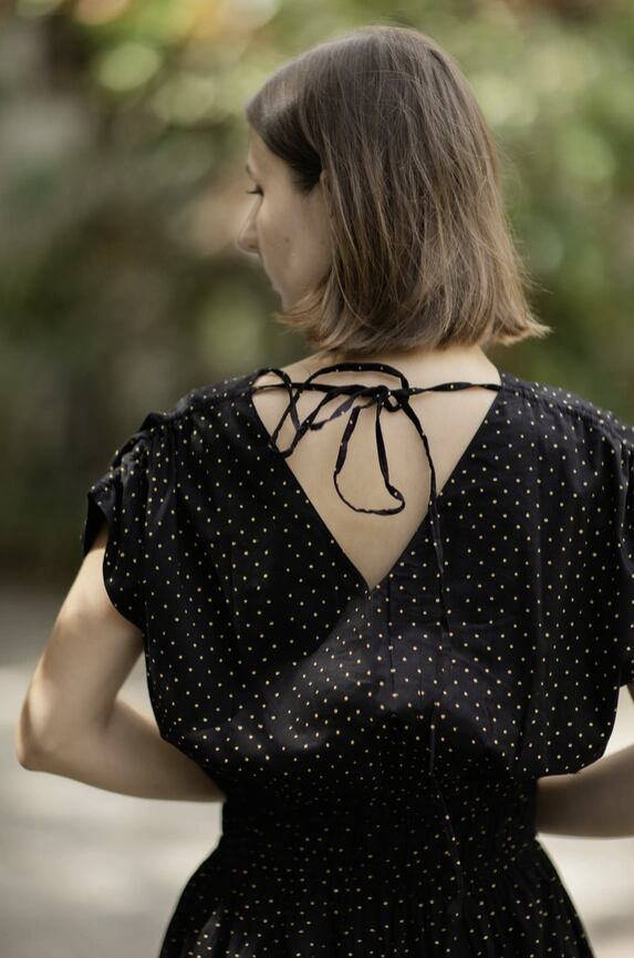 肩紐は引っ張ることでギャザーが出来、袖のシェープを調整いただけます。