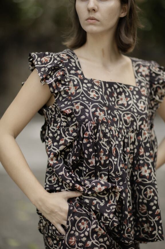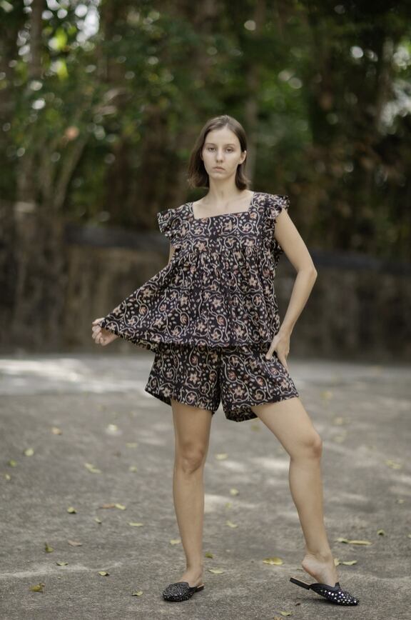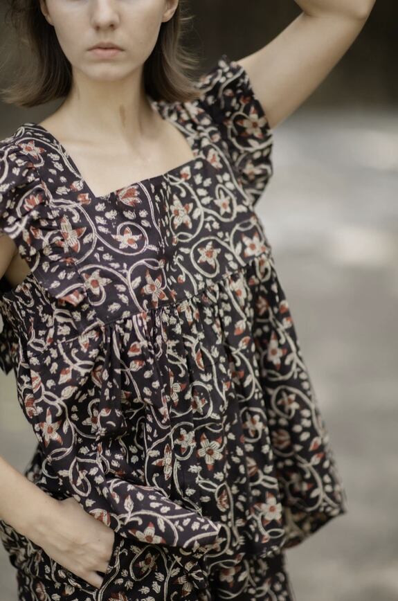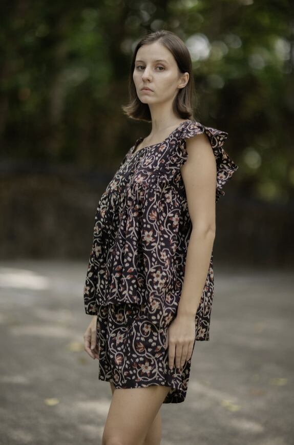 草木染顔料を使ったインドの手仕事ハンドブロックプリントコットン生地でフリルスリーブのスクエアネックトップスとハーフパンツのセットをお作りしました。