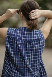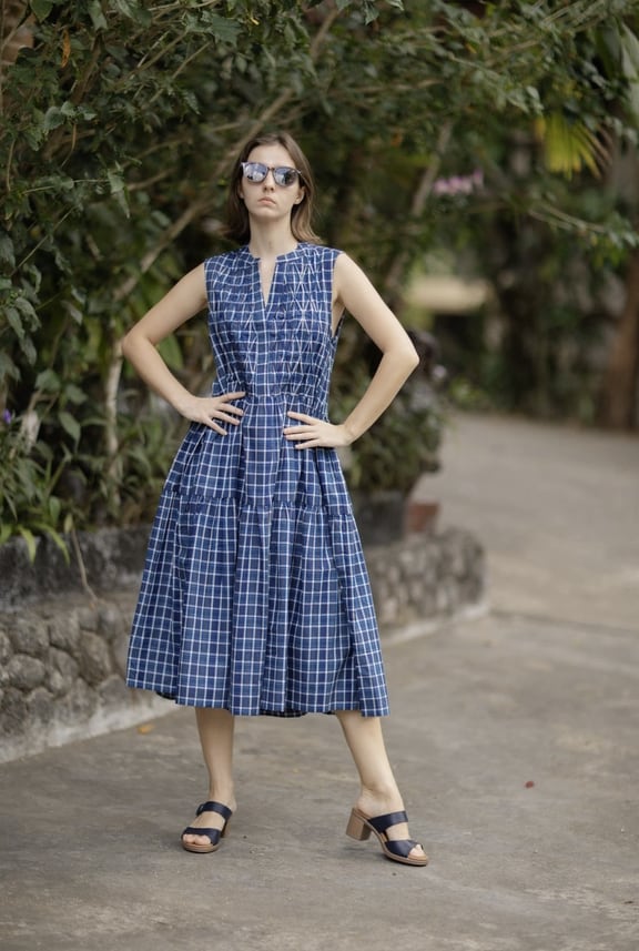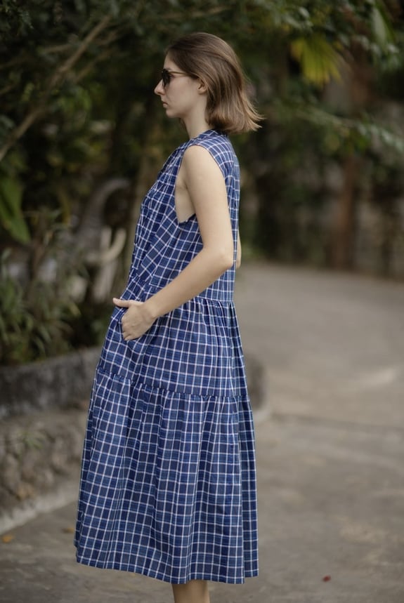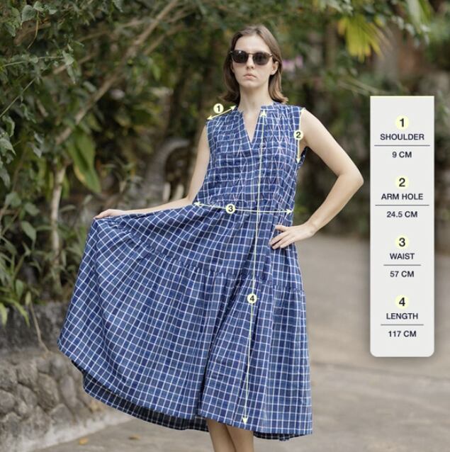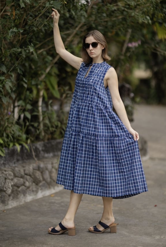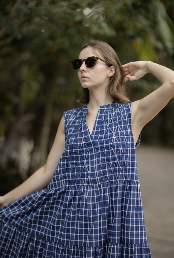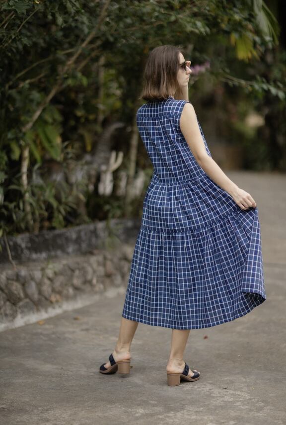 バンドカラースリットネックティアードワンピース(ブルーチェック柄)
