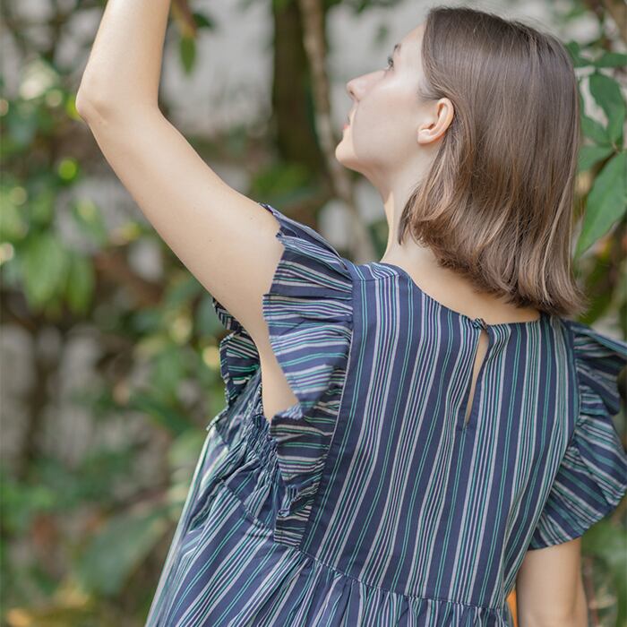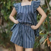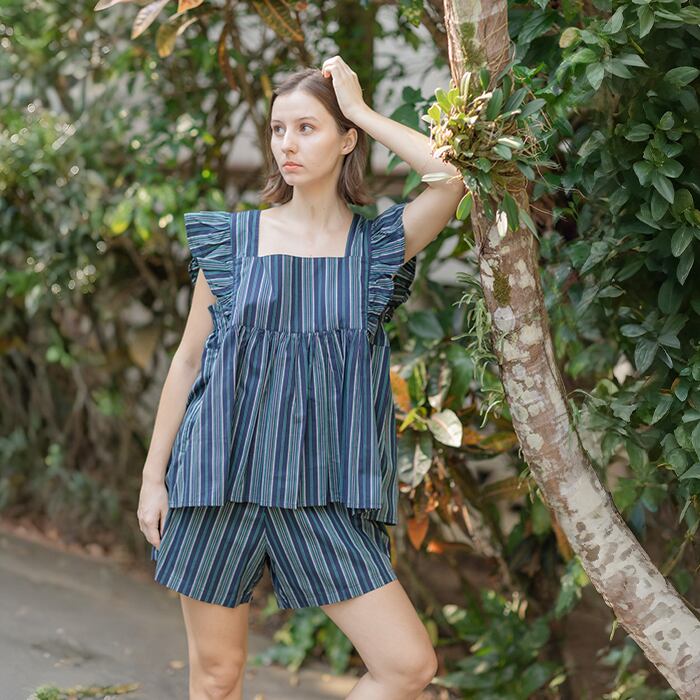 セットアップ(コットン/ストライプ)スクエアネックトップス+ハーフパンツ