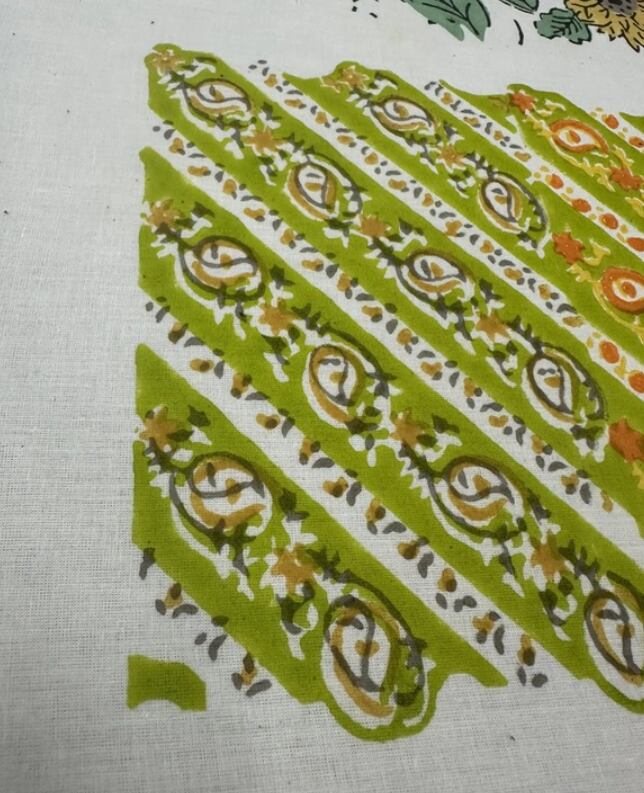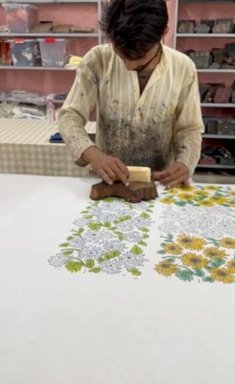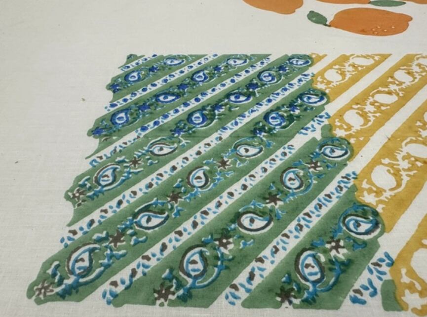 こちらの商品に使われているハンドブロックプリントはインドの職人による手作業で、版を押していく技法が使われています。