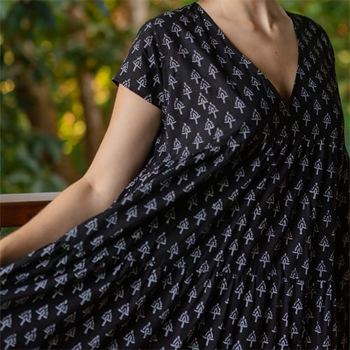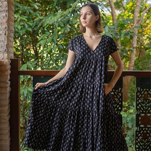バングラデシュ産のきめ細かなコットンボイルに地元のブロックプリント工房で木版を押してもらった布を使用しています。
