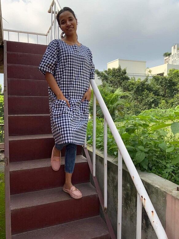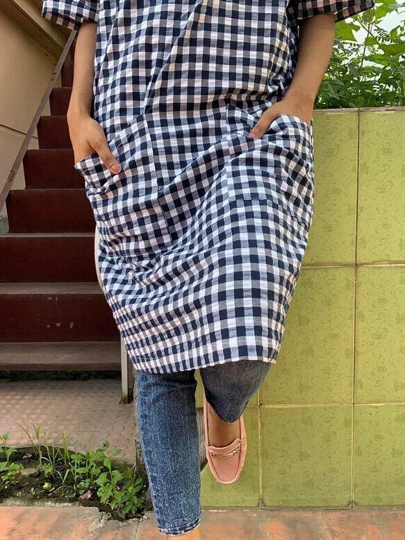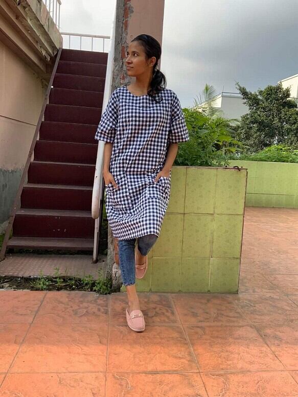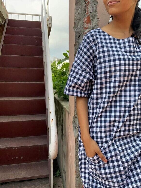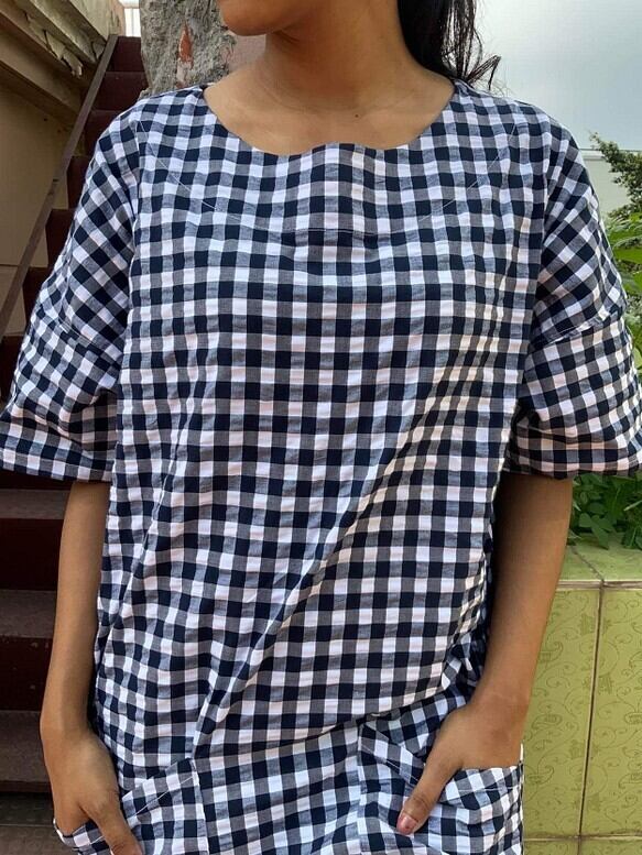 チェック素材のサッカー生地を使って、チュニックを作りました。