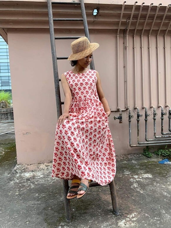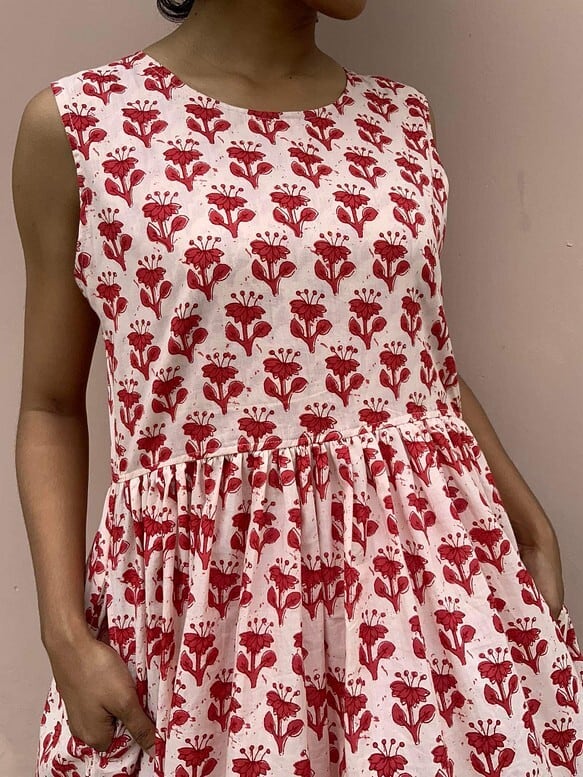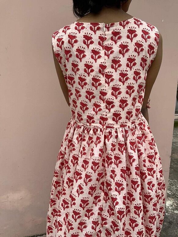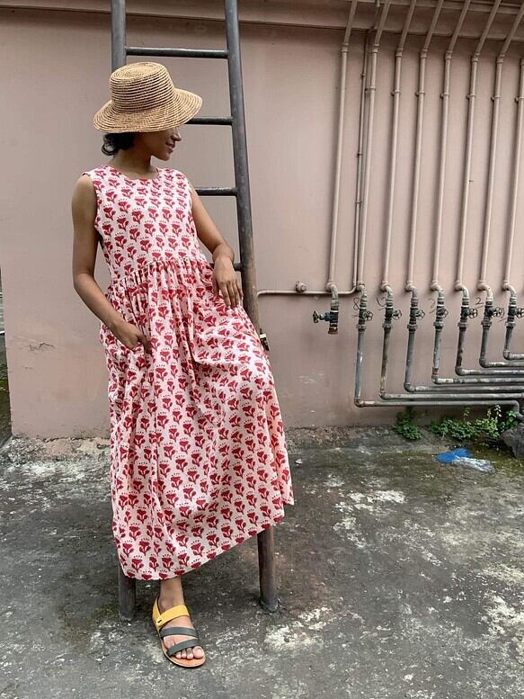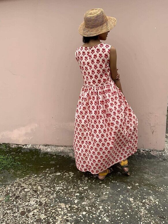 定番のノースリーブ ジッパーワンピースです。前回の柄がデットストックとなってしまった為、新しくストライプ柄を選び作成しました。
