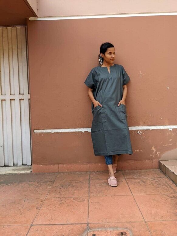 <1週間以内発送>リネンコットン カフタンワンピース(グレー)