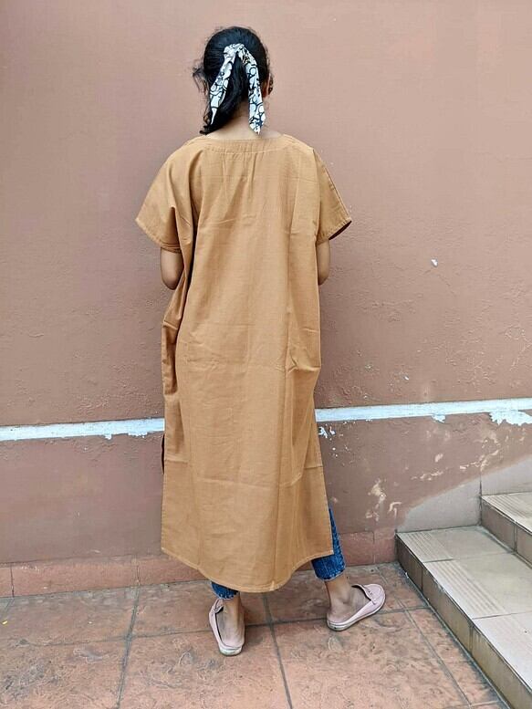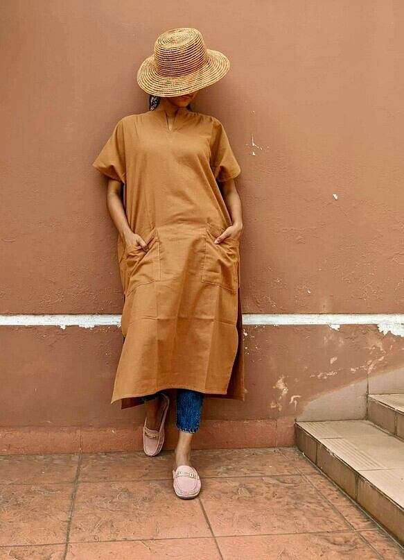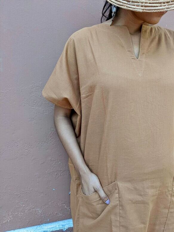 <1週間以内発送>ラミーコットン(コットンリネン) カフタンワンピース(キャメル)