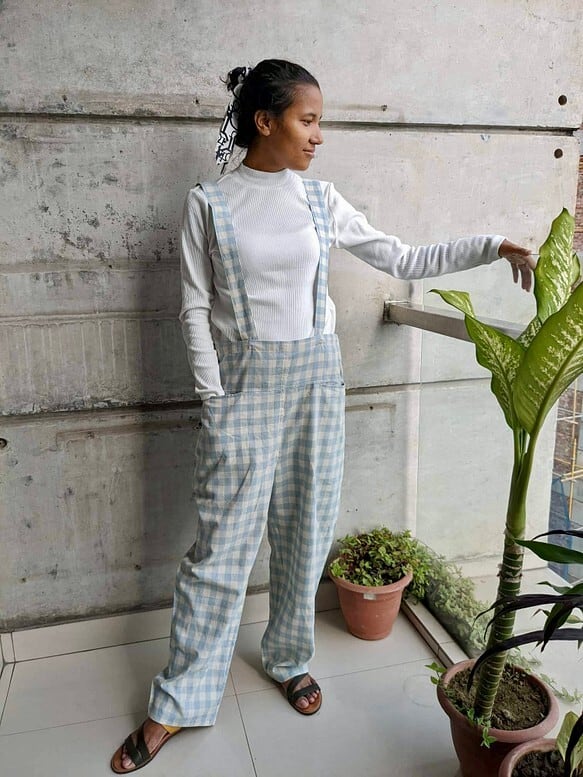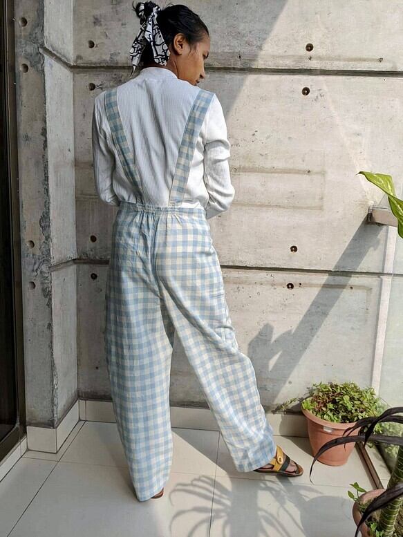 コットンを使ってサスペンダーパンツをおつくりしました。