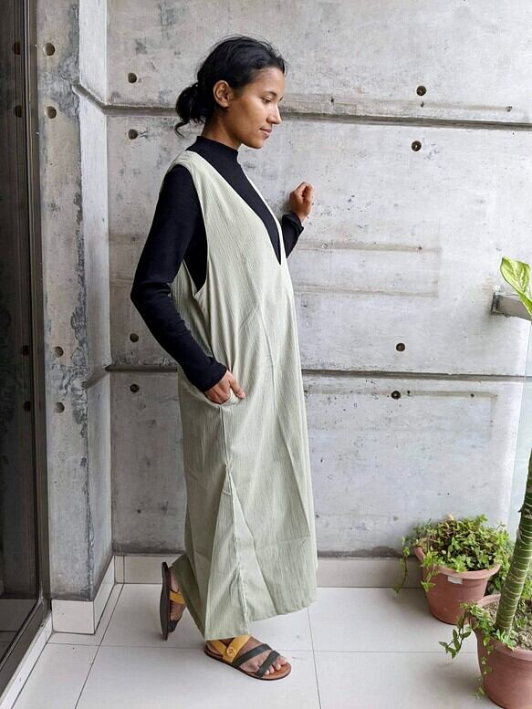 ゆとりのある、でもきれいに見えるジャンパースカートをつくりました。冬はタートルネックと下にはタイツ、夏場はTシャツで1年中活用いただけます!