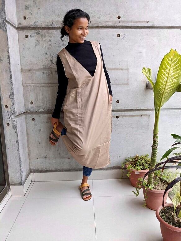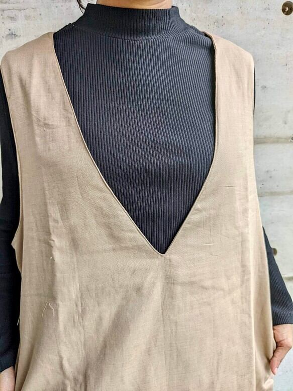ゆとりのある、でもきれいに見えるジャンパースカートをつくりました。冬はタートルネックと下にはタイツ、夏場はTシャツで1年中活用いただけます!