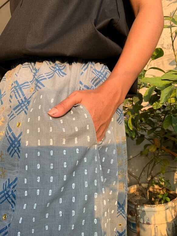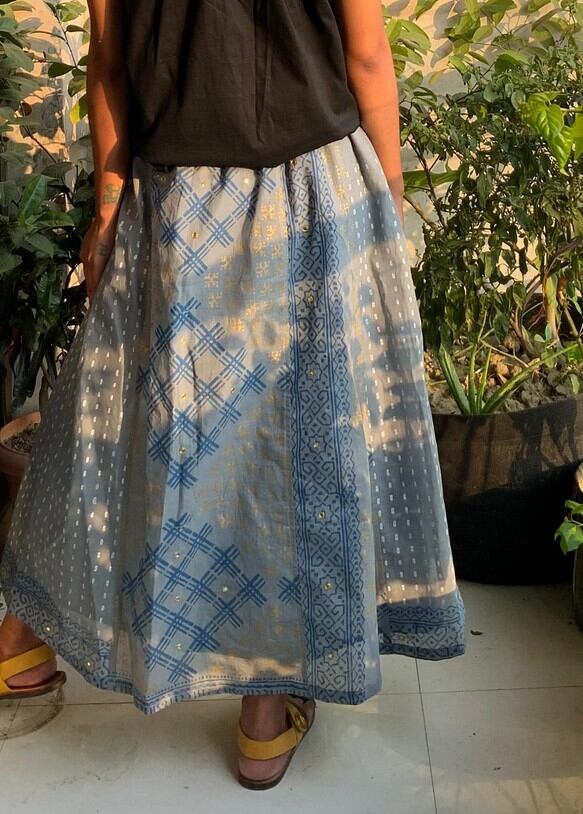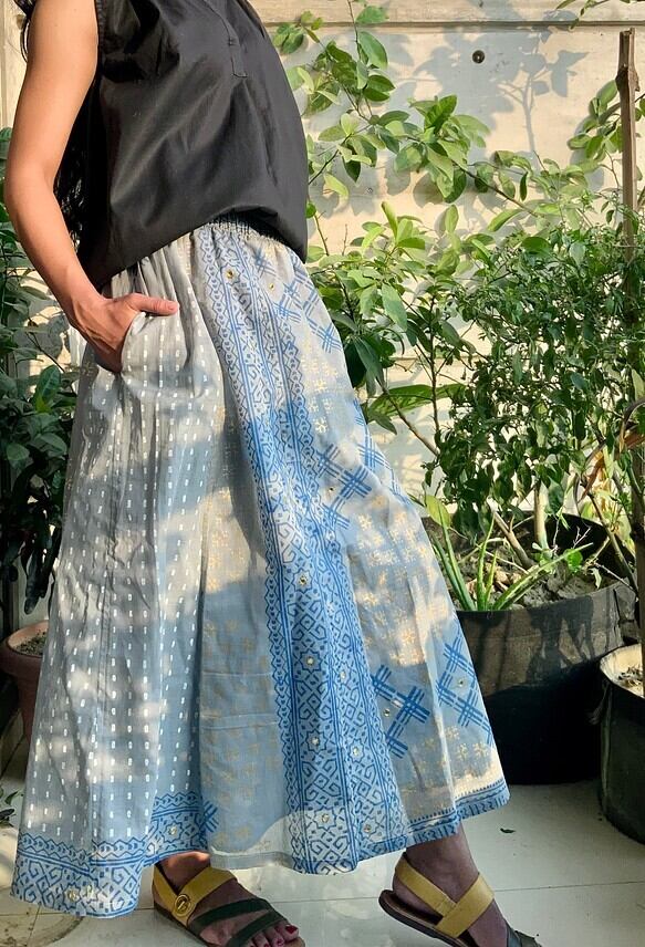 バングラデシュ の、ハンドブロックコットンサリーを贅沢に使用してお作りしたスカートです。