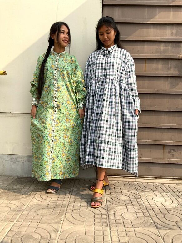 *弊社の取り扱っているインド綿は基本1ロール20M程度となっており、また多くの洋服が4-5M必要とするようなギャザーやタックが入っているもののため1つの柄布から4-5着しかお作りする事ができません。商品の販売を複数サイトで行っており、在庫の更新が間に合わなく同じタイミングで布の在庫以上の商品の購入を受けてしまう事があったり、布に落ちないシミが見つかったりして商品の縫製が出来ない事がございます。