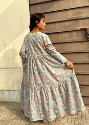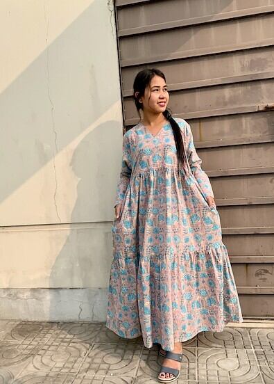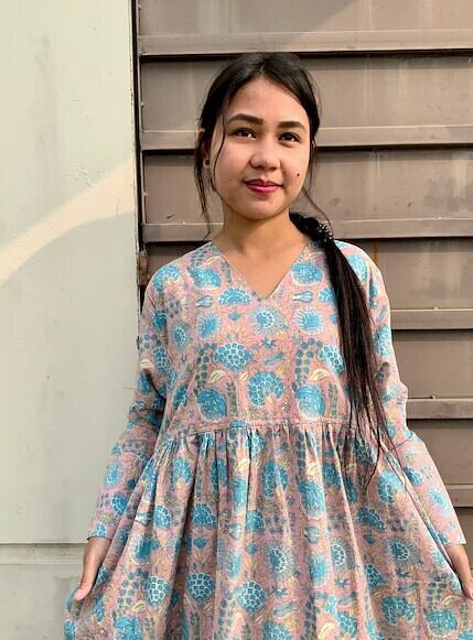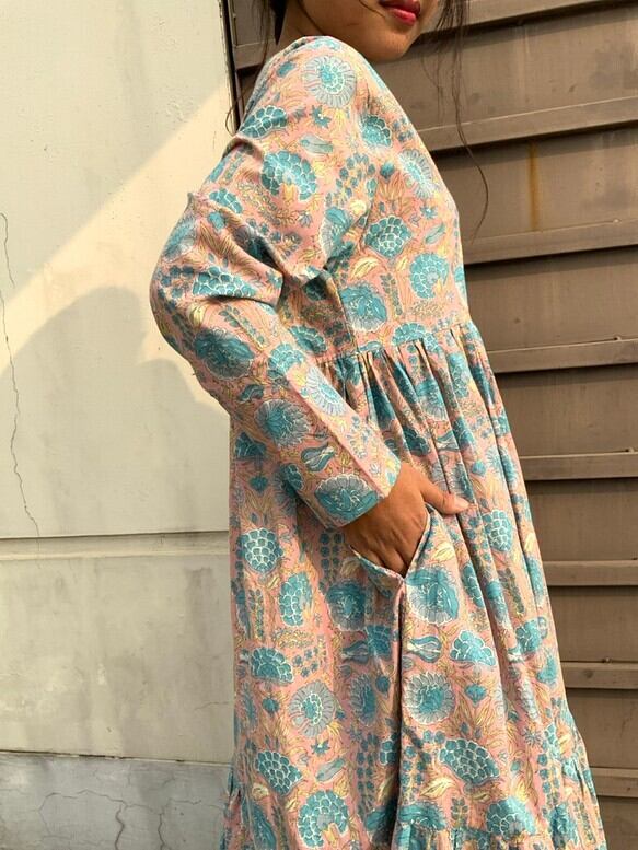 胸元と全体と2種類のインド綿を組み合わせたワンピースです。