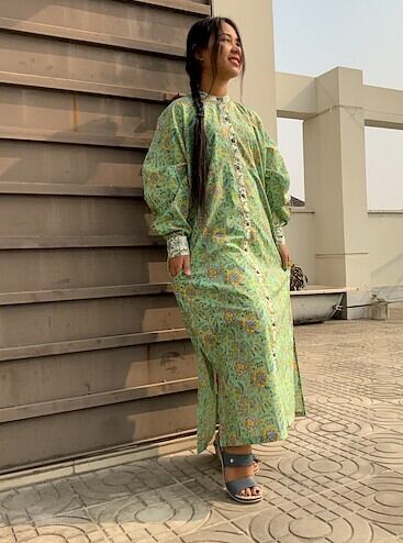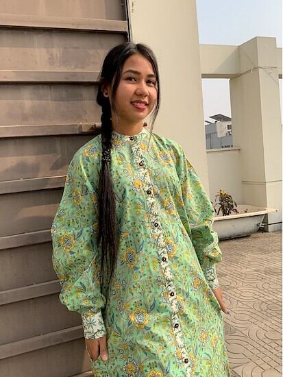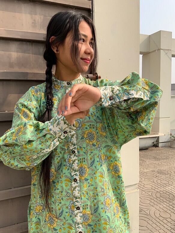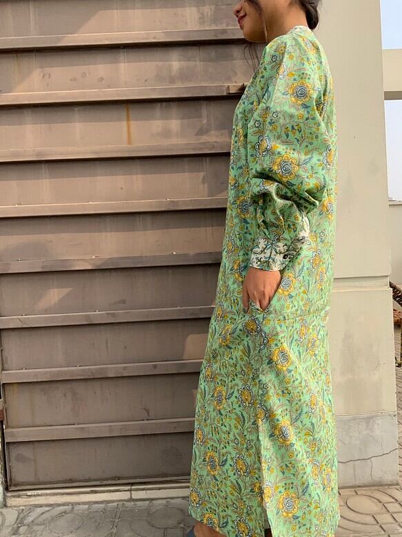 *弊社の取り扱っているインド綿は基本1ロール20M程度となっており、また多くの洋服が4-5M必要とするようなギャザーやタックが入っているもののため1つの柄布から4-5着しかお作りする事ができません。商品の販売を複数サイトで行っており、在庫の更新が間に合わなく同じタイミングで布の在庫以上の商品の購入を受けてしまう事があったり、布に落ちないシミが見つかったりして商品の縫製が出来ない事がございます。
