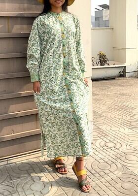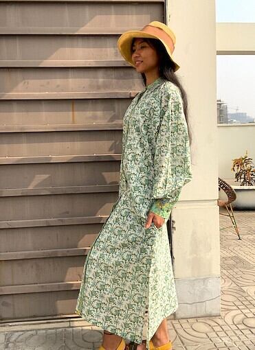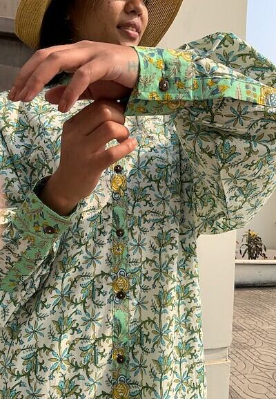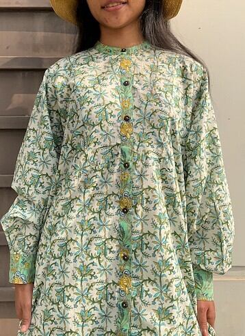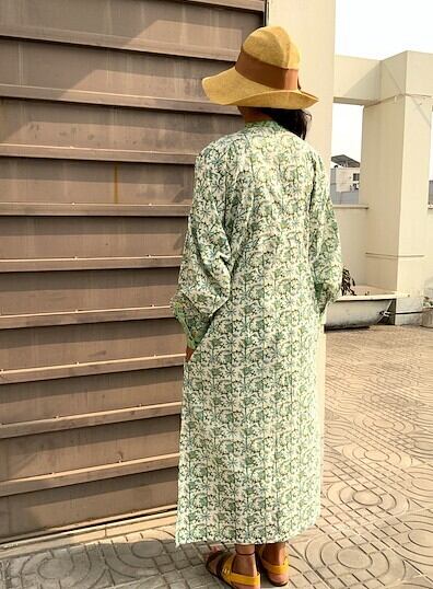 *弊社の取り扱っているインド綿は基本1ロール20M程度となっており、また多くの洋服が4-5M必要とするようなギャザーやタックが入っているもののため1つの柄布から4-5着しかお作りする事ができません。商品の販売を複数サイトで行っており、在庫の更新が間に合わなく同じタイミングで布の在庫以上の商品の購入を受けてしまう事があったり、布に落ちないシミが見つかったりして商品の縫製が出来ない事がございます。
