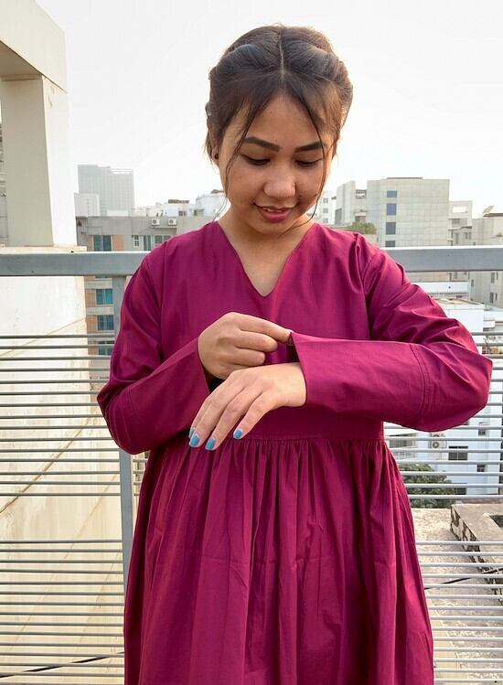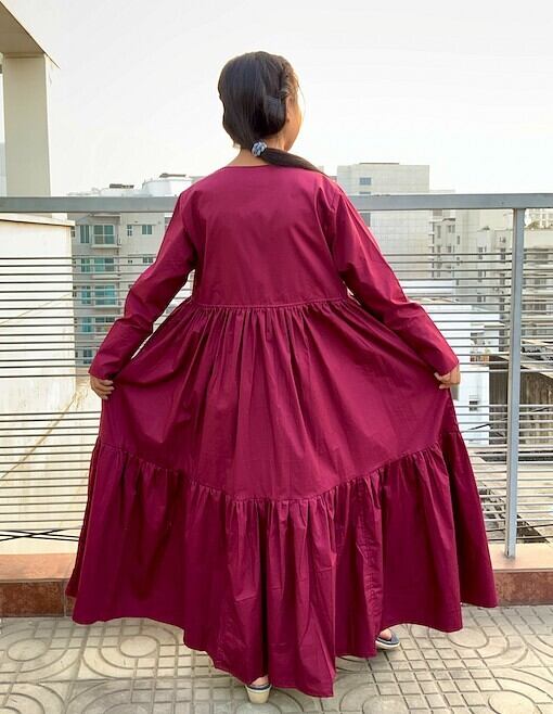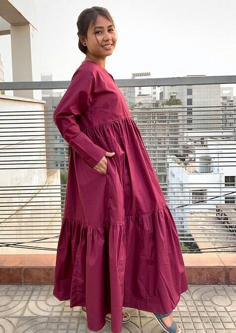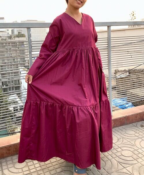 <新作 3点限定>ハイカウントコットンVネックティアードワンピース(ワインレッド)