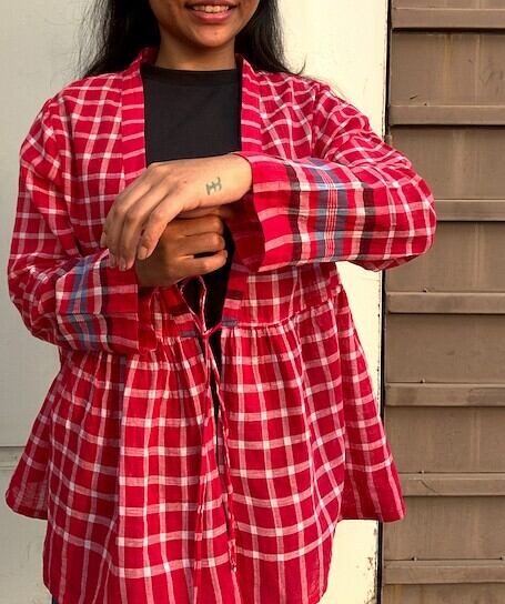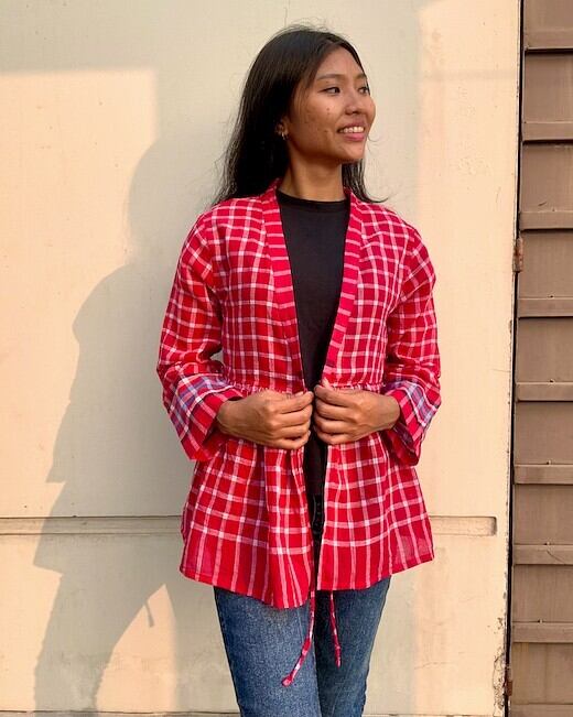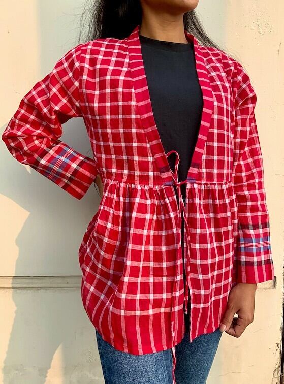 バングラデシュ の、働く人たちの必需品、ガムチャ(手拭い)生地を使った羽織です。(生地は薄手で透けます)