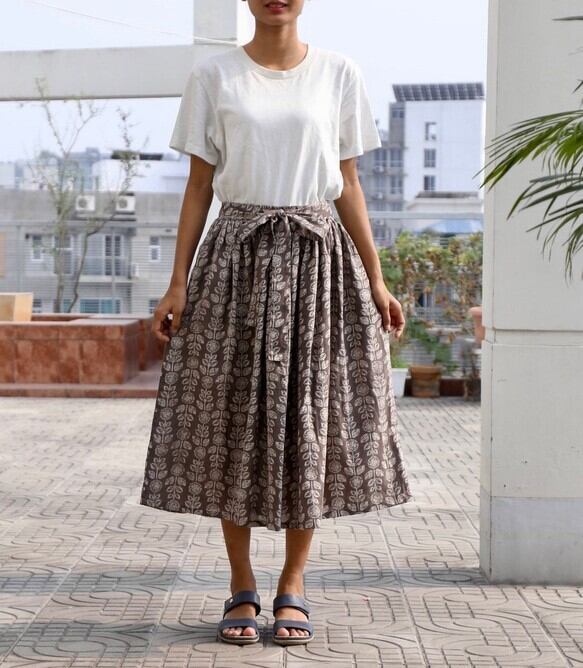 <<在庫一掃セール>>ハンドプリントコットンのリボンスカート