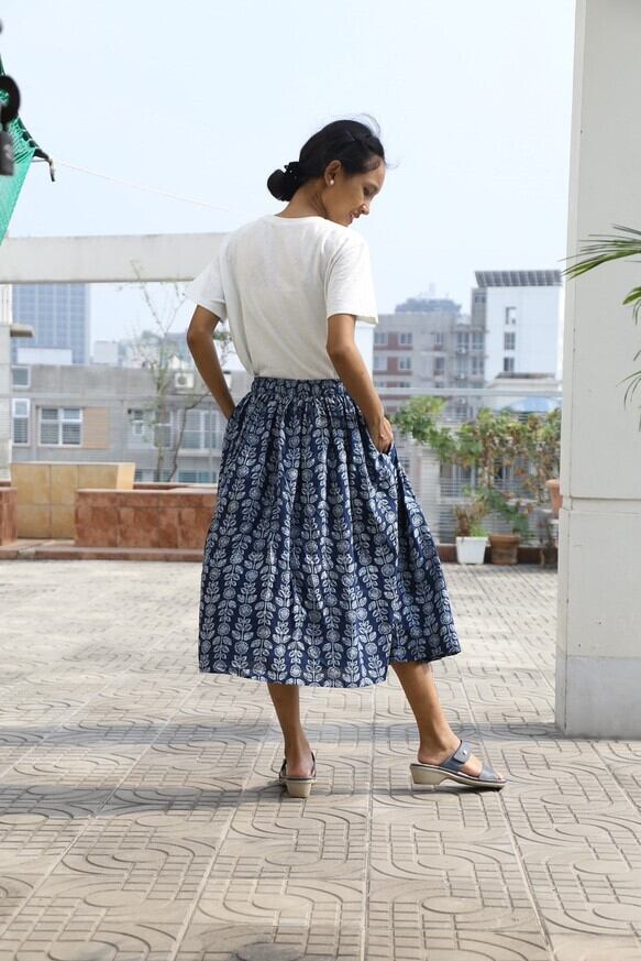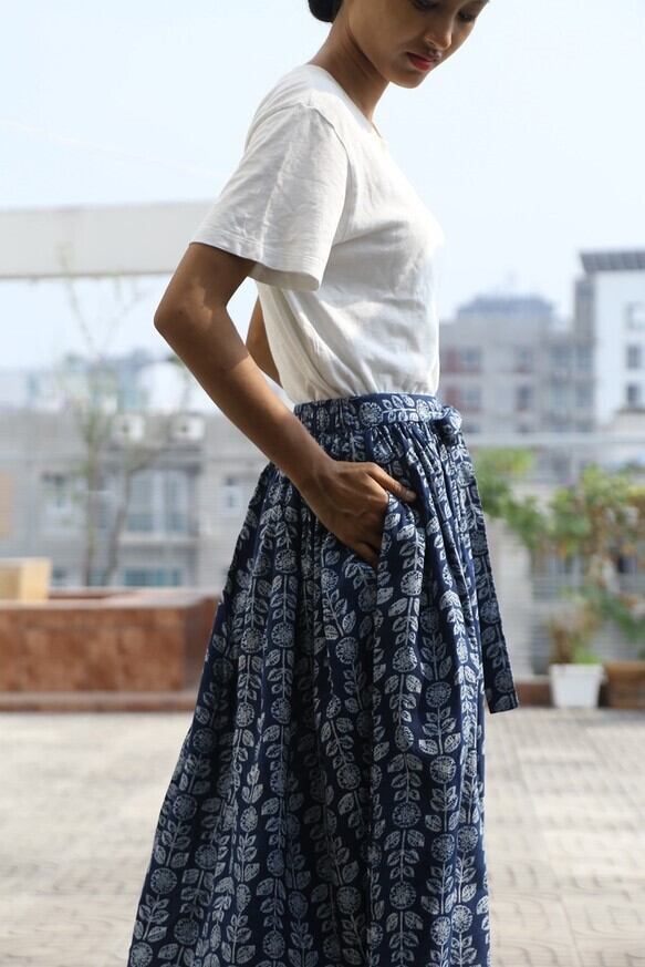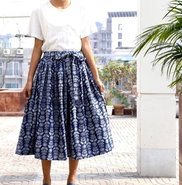 ハンドプリントコットンのリボンスカート