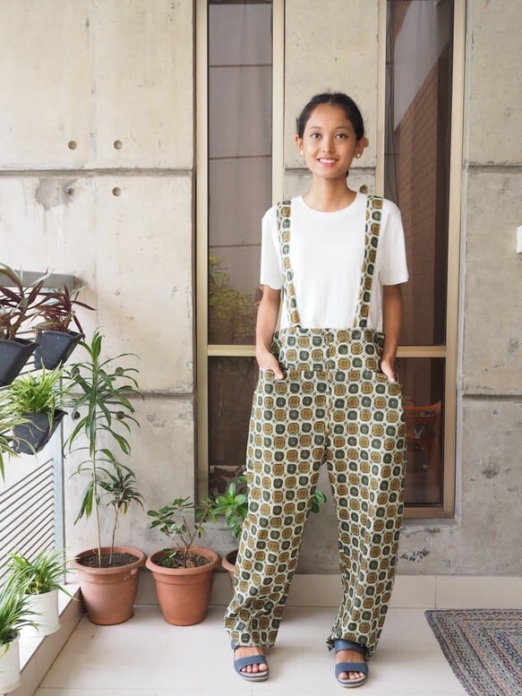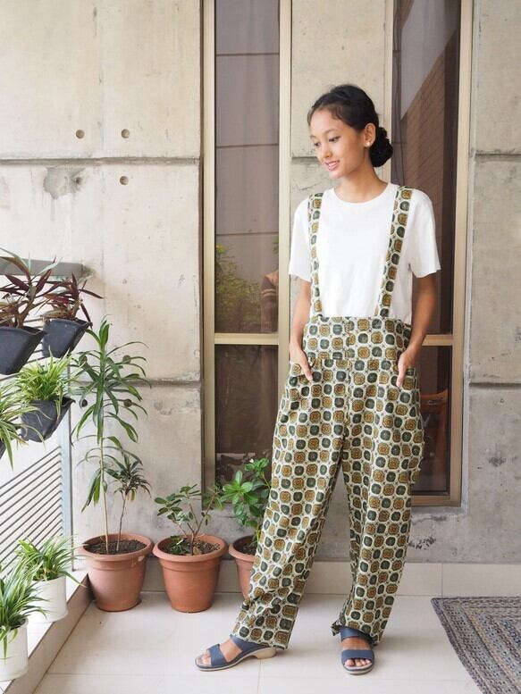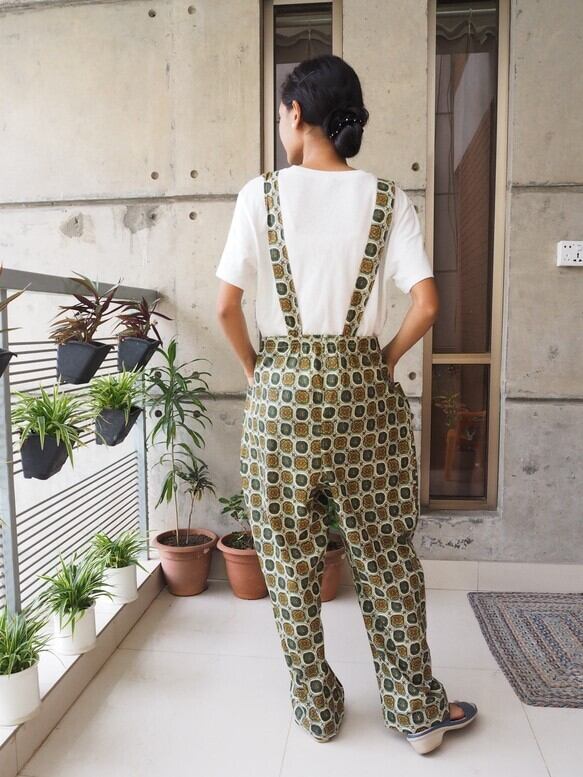 インド綿素材を使ってサスペンダーパンツをおつくりしました。
