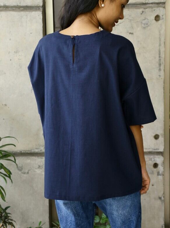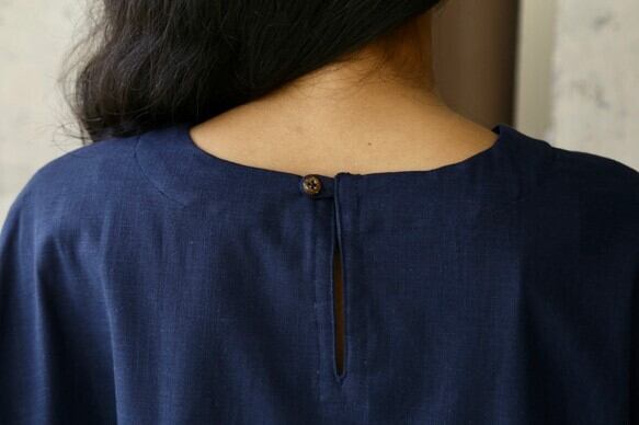 伸縮性のないお素材なので、背中側にボタンをつけてあります。