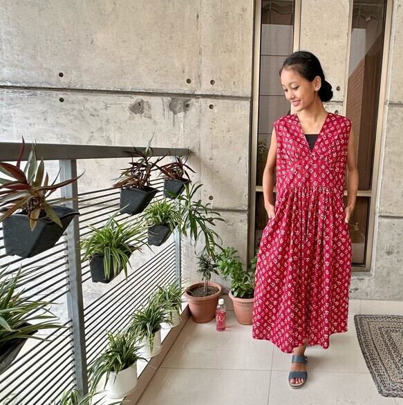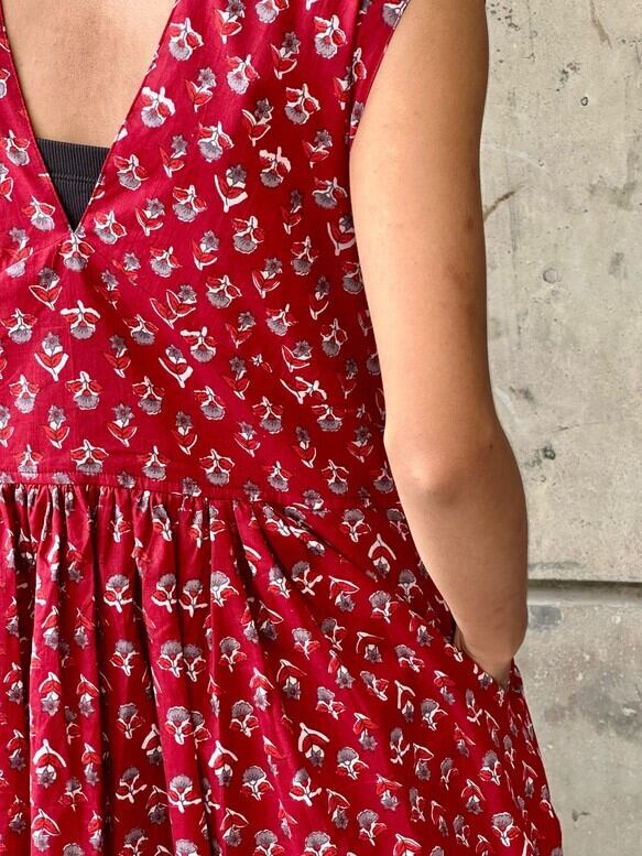 <インド綿/スクリーンプリント>コットン細見えVネックワンピース