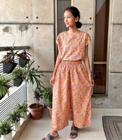 トップスはフレンチスリーブ、パンツはワイド幅のパンツとなっています。