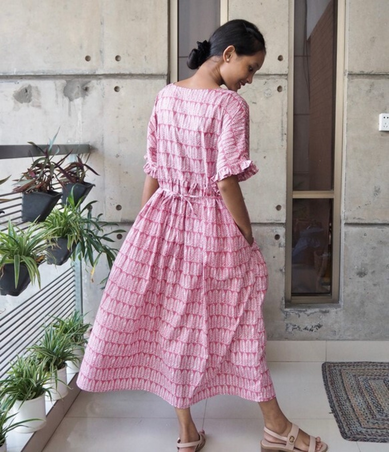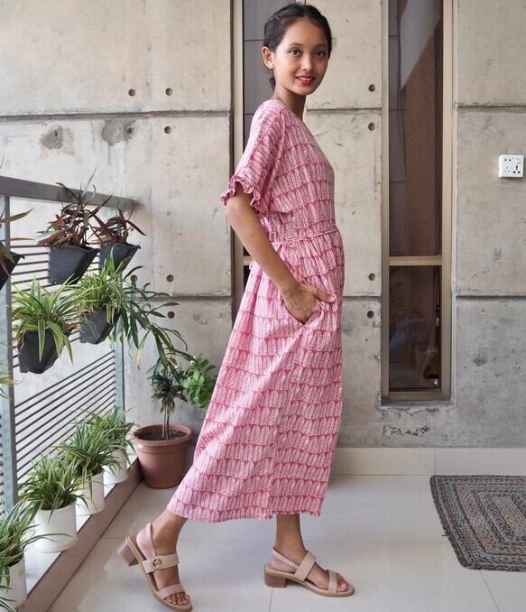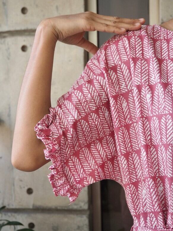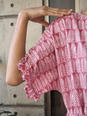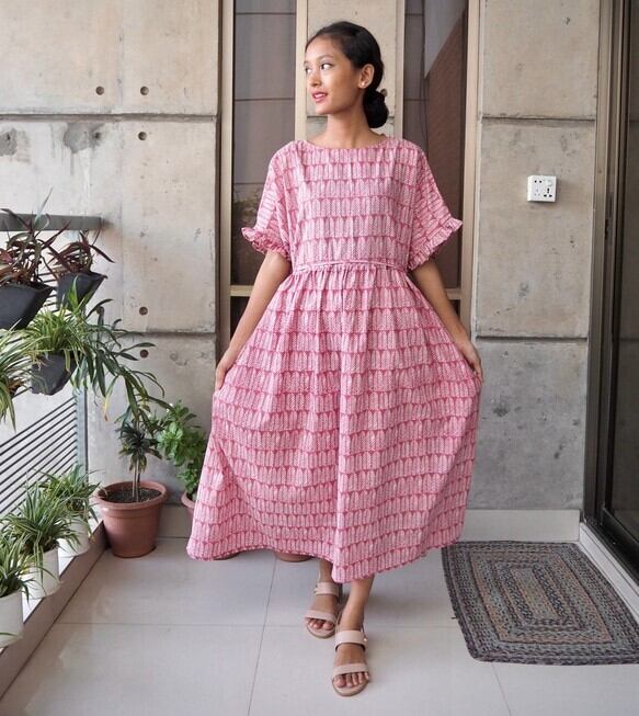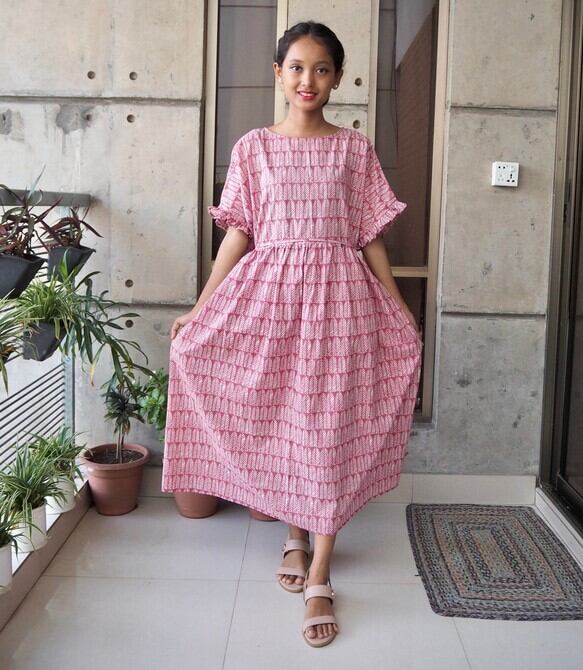 フリルスリーブワンピース(インド綿、スクリーンプリント)