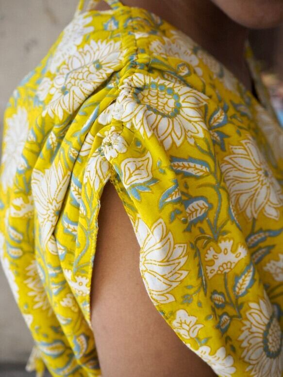 肩紐は引っ張ることでギャザーが出来、袖のシェープを調整いただけます。
