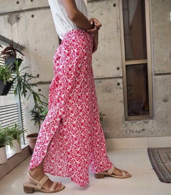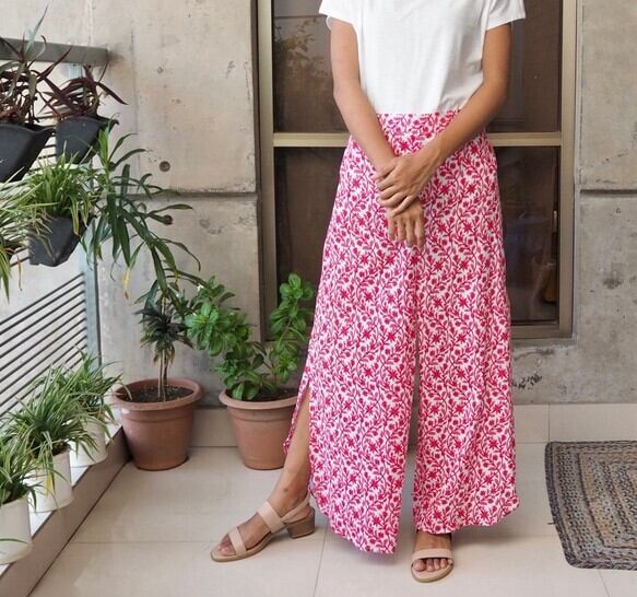 インドのスクリーンプリントでおつくりしましたサイドスリットパンツです。