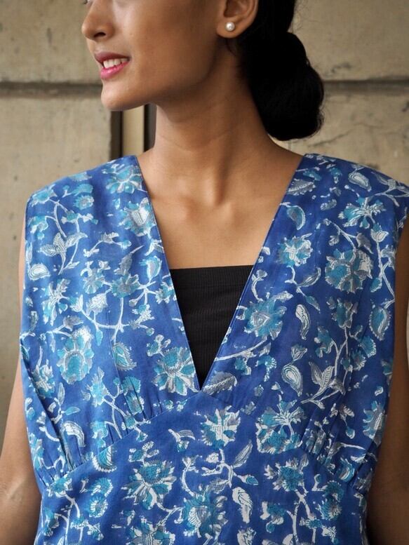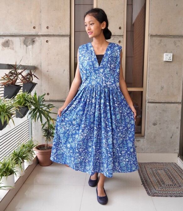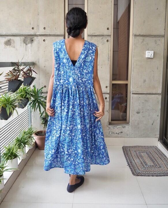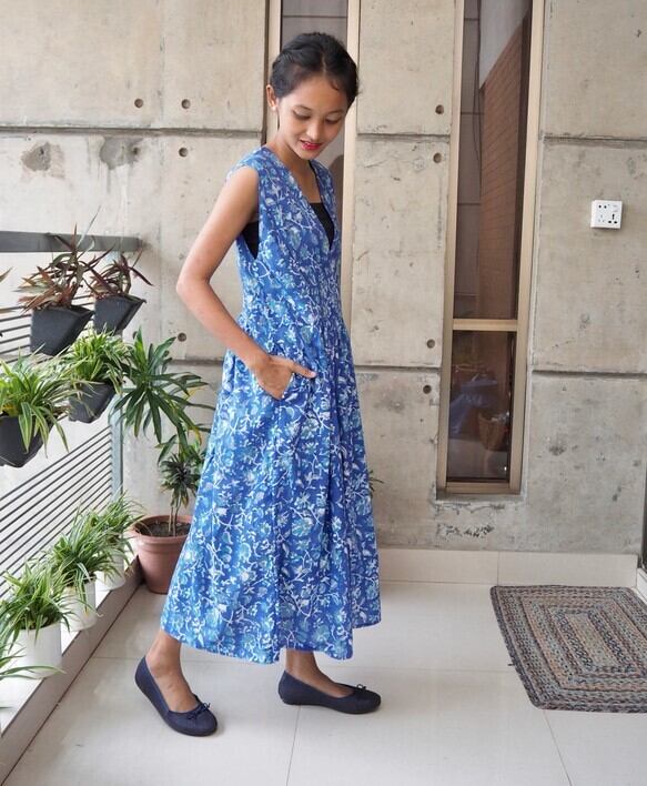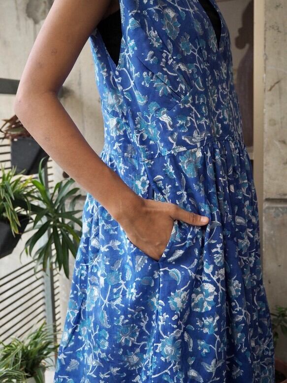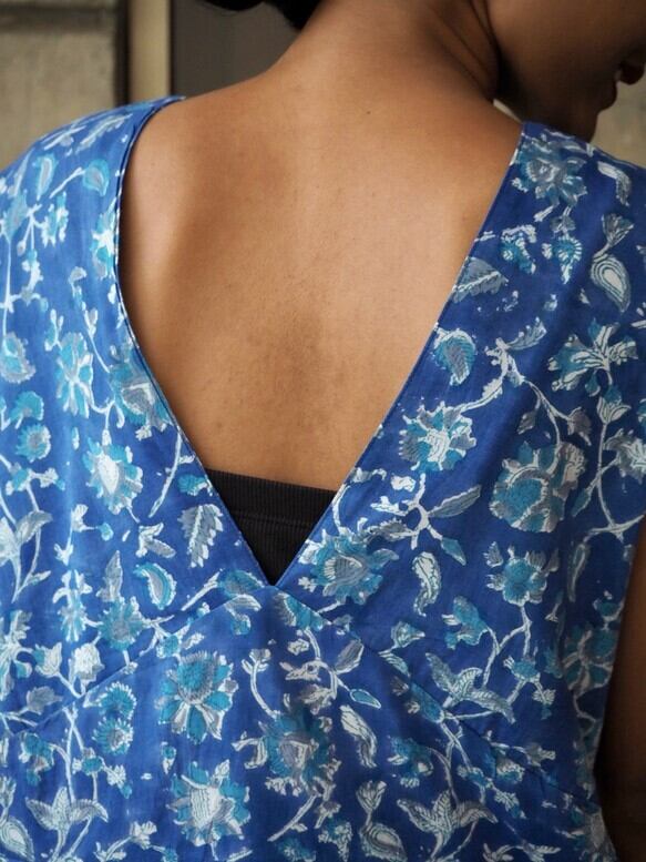 <インド綿/ハンドブロックプリント>コットン細見えVネックワンピース