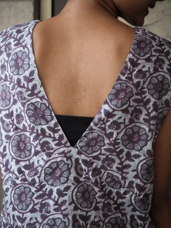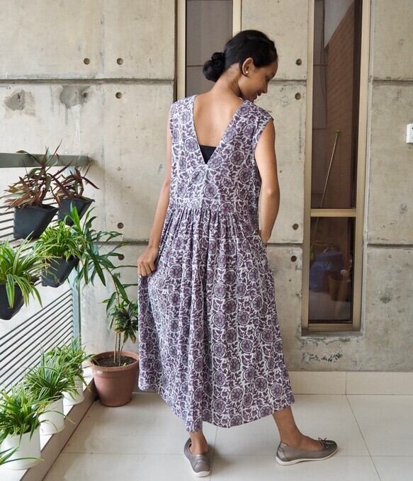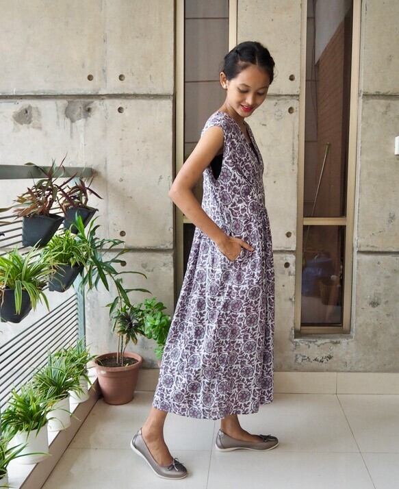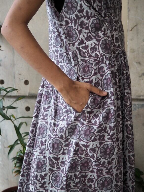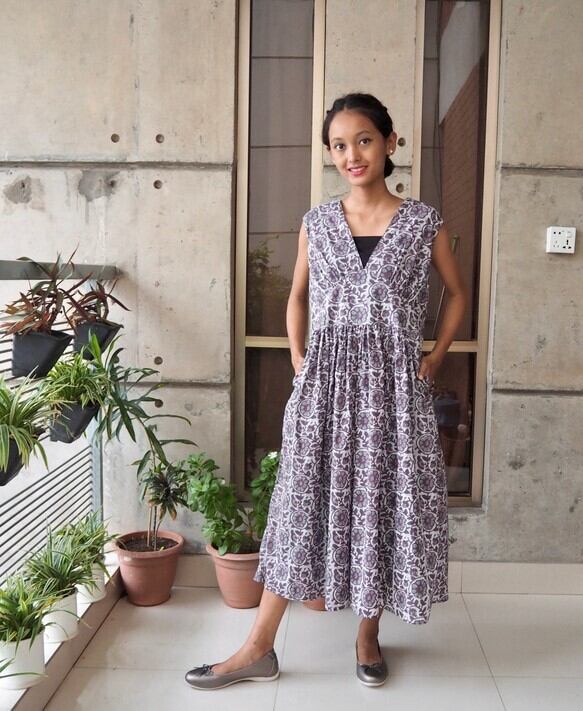 <インド綿/スクリーンプリント>コットン細見えVネックワンピース