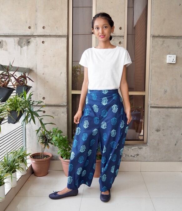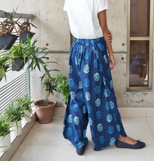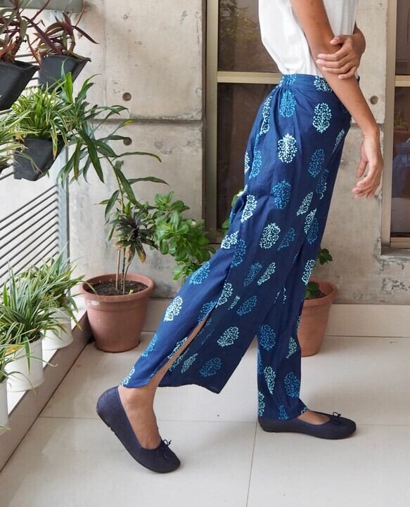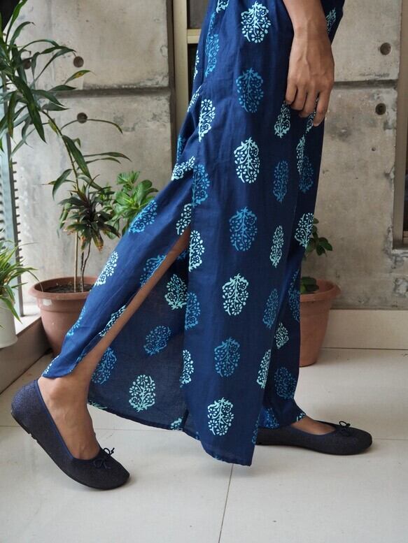 インドのスクリーンプリントでおつくりしましたサイドスリットパンツです。