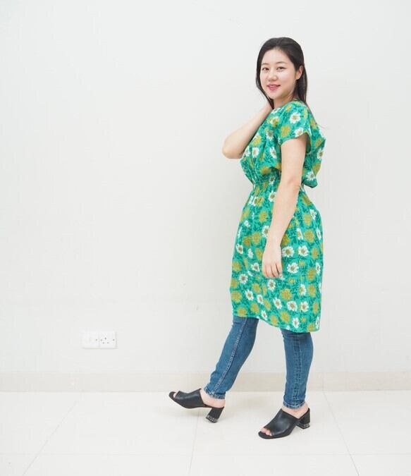 ウエストにゴムを入れてありますので着ていただくとスッキリ見えます。
