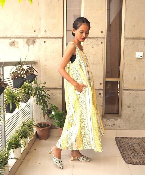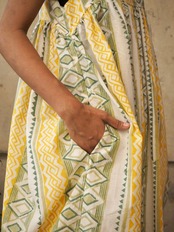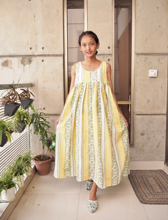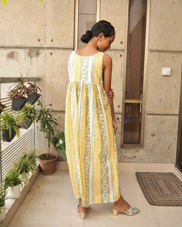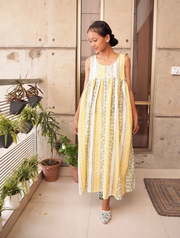 ギャザーワンピース(ハンドブロックプリントコットン)