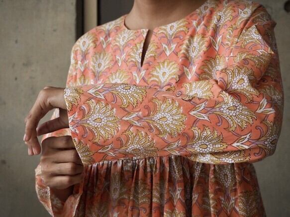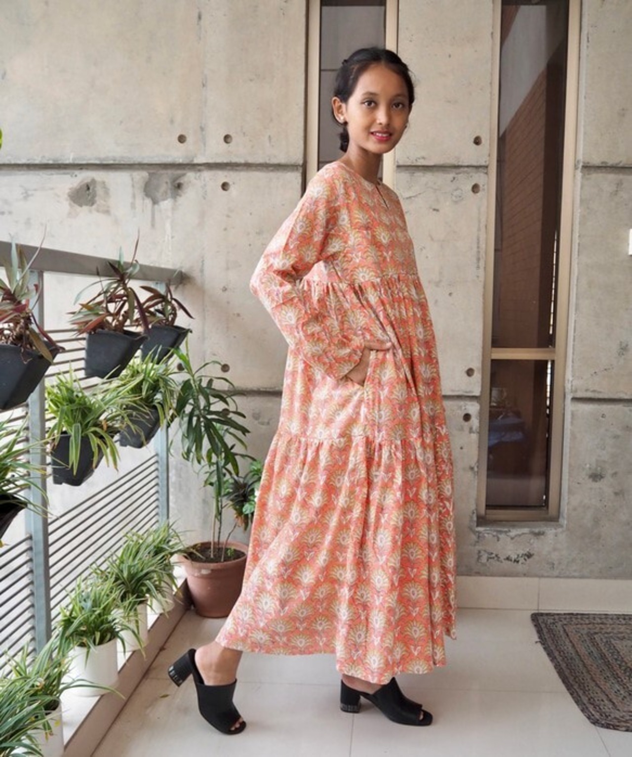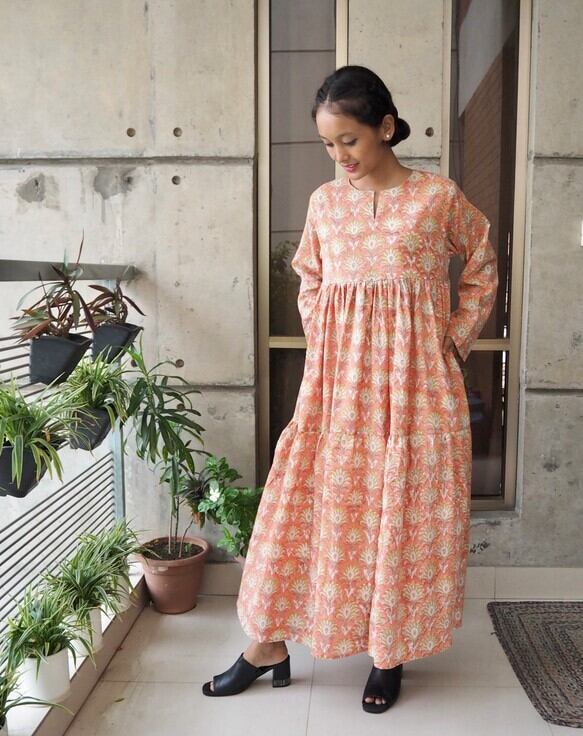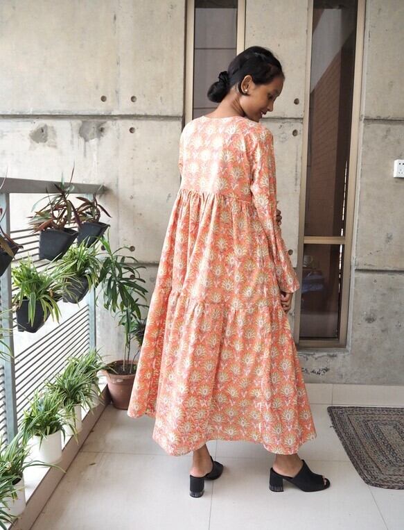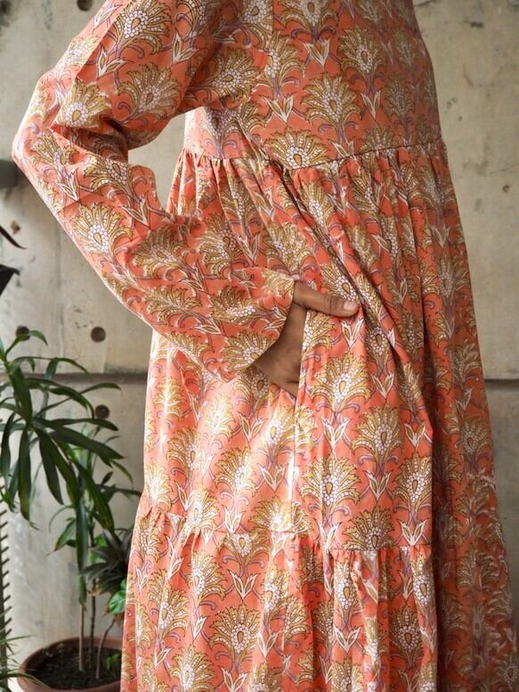 インド綿ティアードワンピース(ハンドブロックプリント)