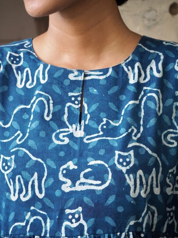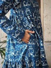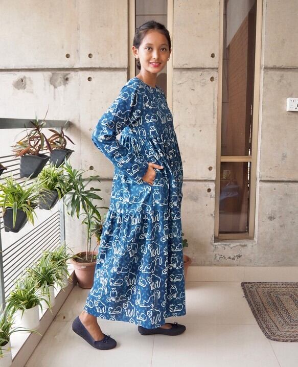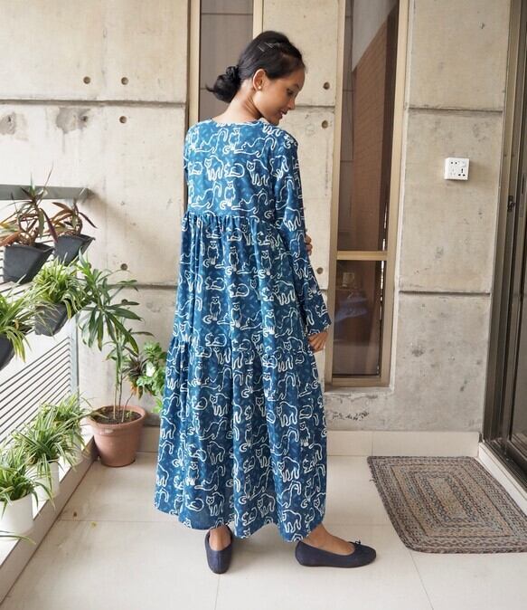 猫柄インド綿ティアードワンピース(ハンドブロックプリント)