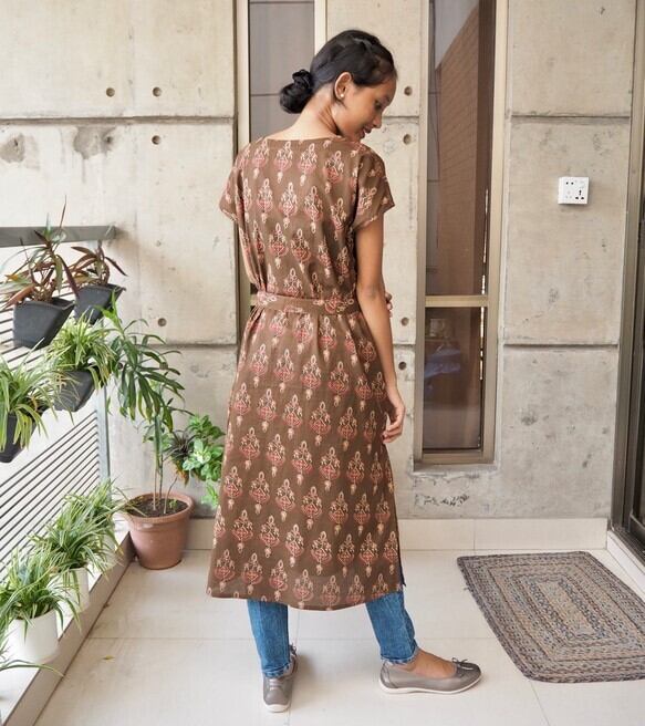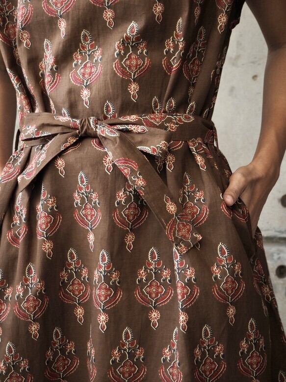 サイドスリット入りリボンワンピース<ハンドブロックプリント>