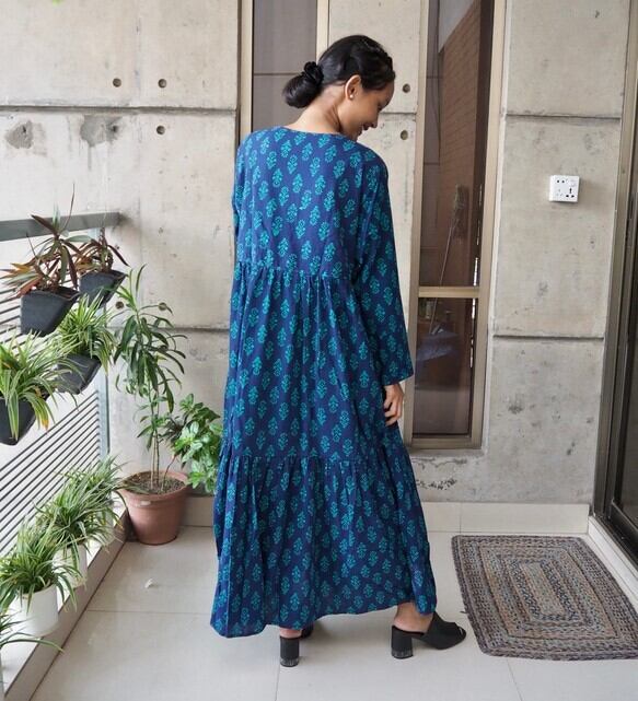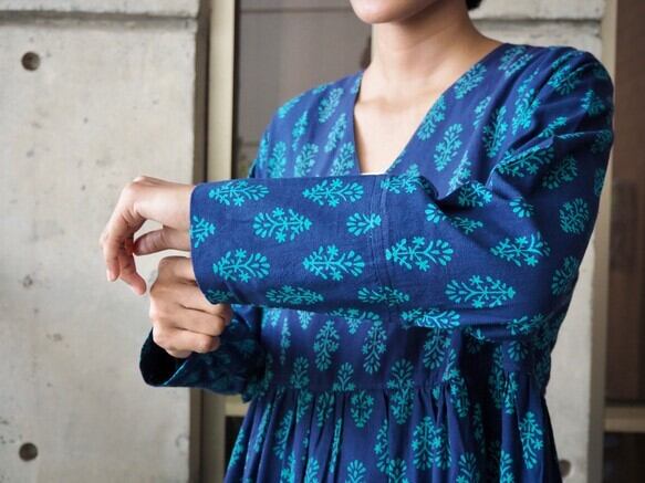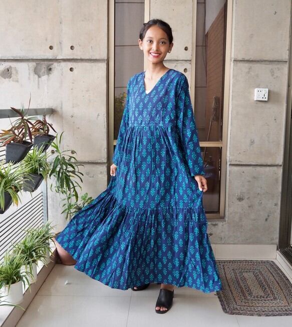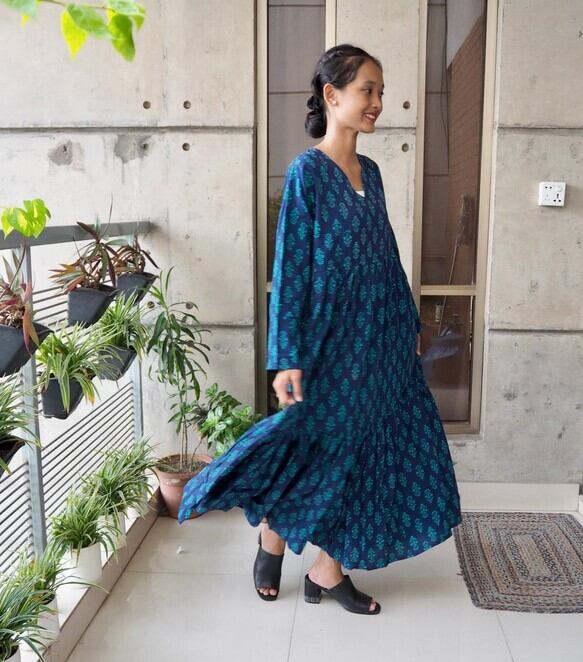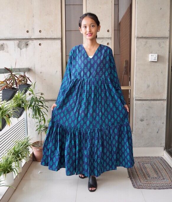 インド綿Vネックティアードワンピース(スクリーンプリント)