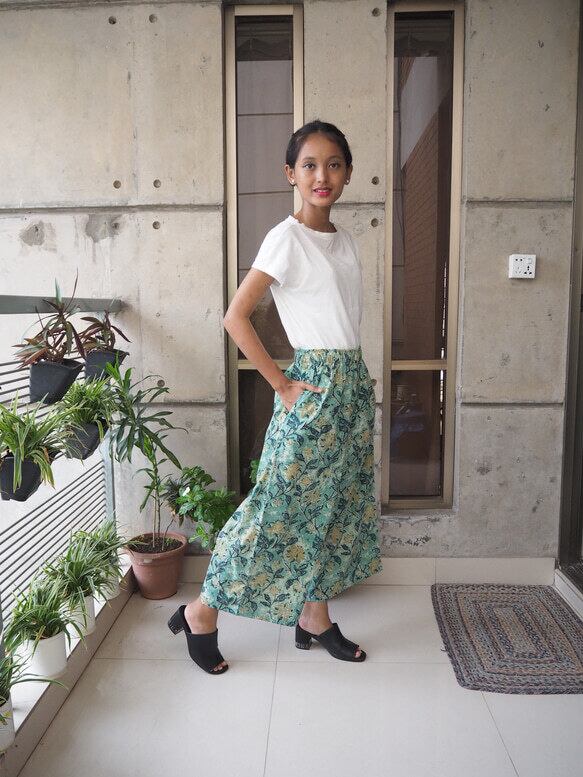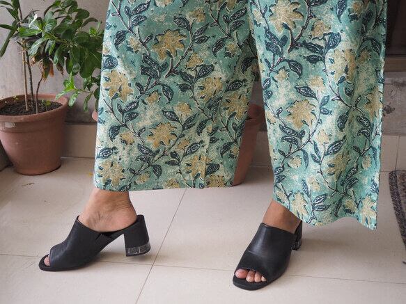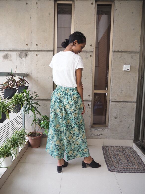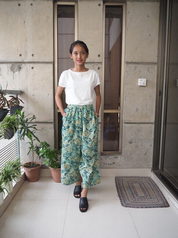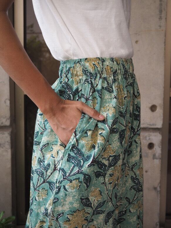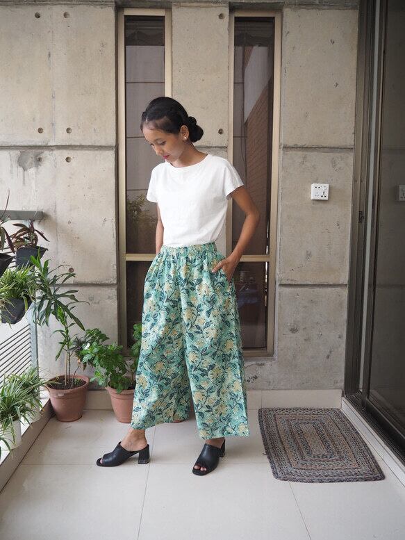 インドの手仕事ハンドブロックプリントコットン生地で楽チンに履いていただけるけどキレイに見えるワイドパンツを作りました!