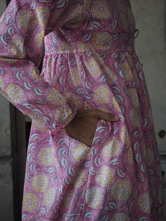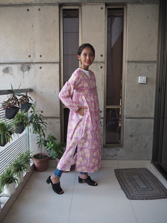 インド綿を使ったワンピースです。(単体では透けるので、下にインナーパンツ、デニムなどの着用をお勧めします。)